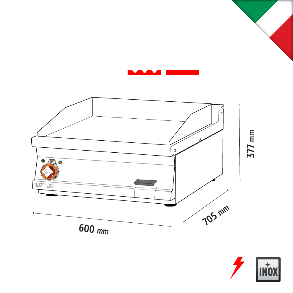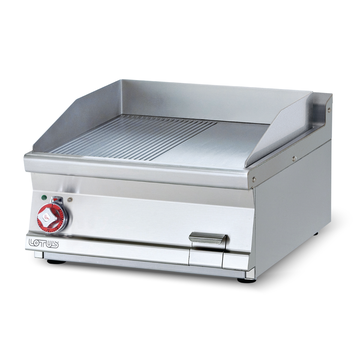 Ηλεκτρικό πλατώ μεσαίο 1/2 λείο 1/2 ραβδωτό του εργοστασίου Lotus Ιταλίας. Κατασκευασμένο με χρήση ανοξείδωτου χάλυβα ποιότητας (CrNi 18/10 AISI 304) , με διακόπτες αδιάβροχης ποιότητας (IPX5).