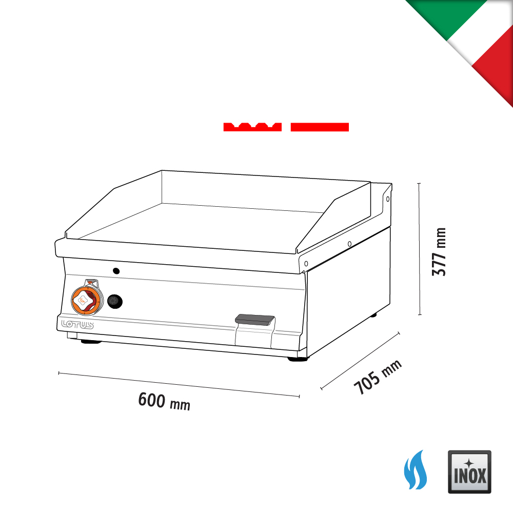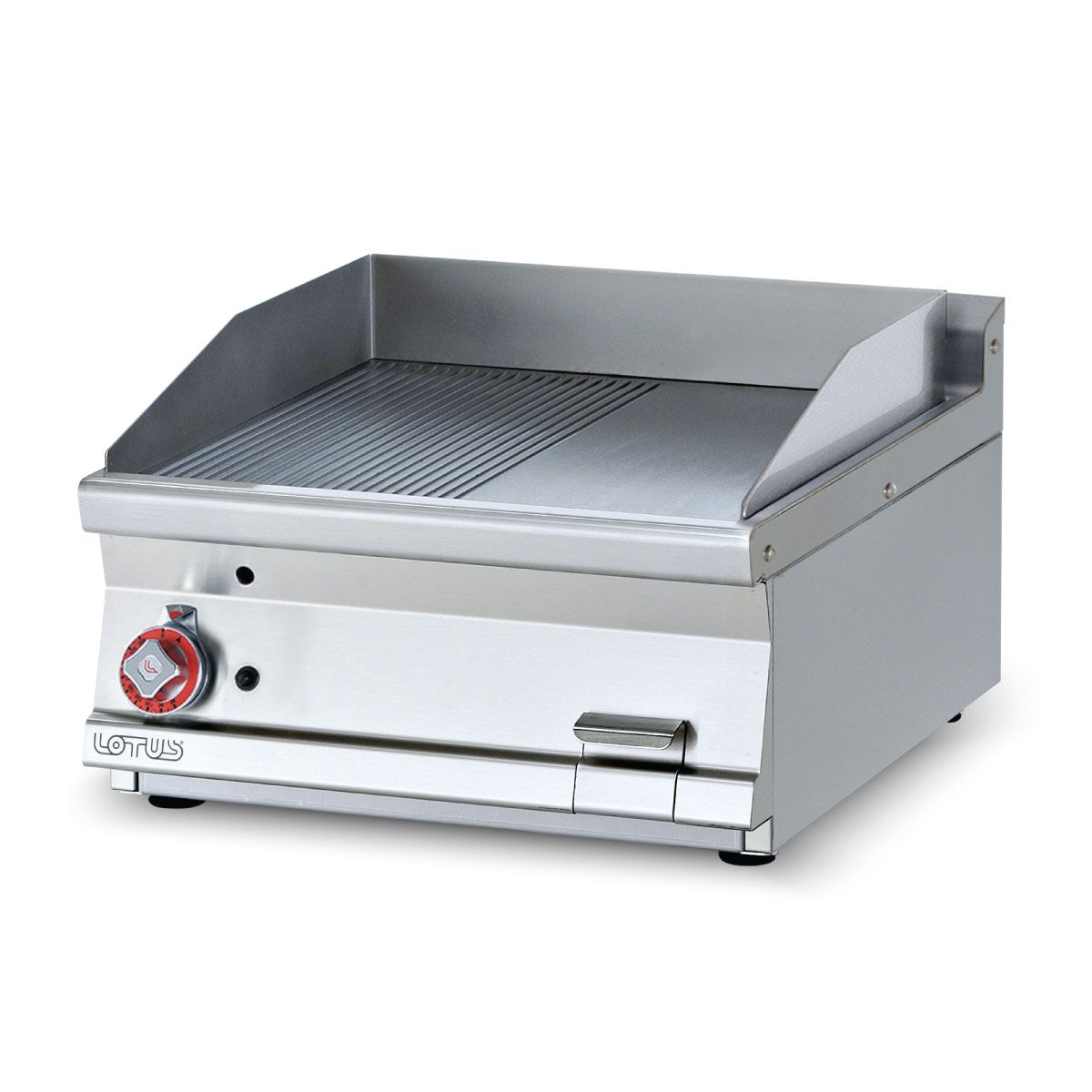 Πλατώ αερίου μεσαίο , 1/2 λείο & 1/2 ραβδωτό , του εργοστασίου Lotus Ιταλίας. Κατασκευασμένο με χρήση ανοξείδωτου χάλυβα ποιότητας (CrNi 18/10 AISI 304) , με διακόπτες αδιάβροχης ποιότητας (IPX5).