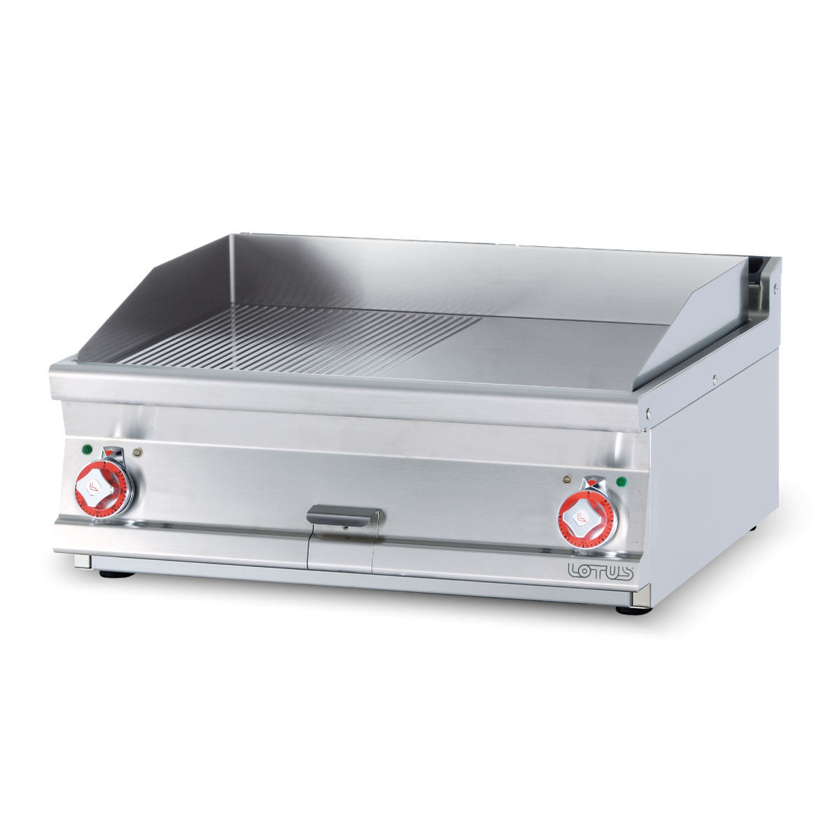 Ηλεκτρικό πλατώ διπλό , 1/2 λείο & 1/2 ραβδωτό χρωμίου , του εργοστασίου Lotus Ιταλίας. Κατασκευασμένο με χρήση ανοξείδωτου χάλυβα ποιότητας (CrNi 18/10 AISI 304) , με διακόπτες αδιάβροχης ποιότητας (IPX5).