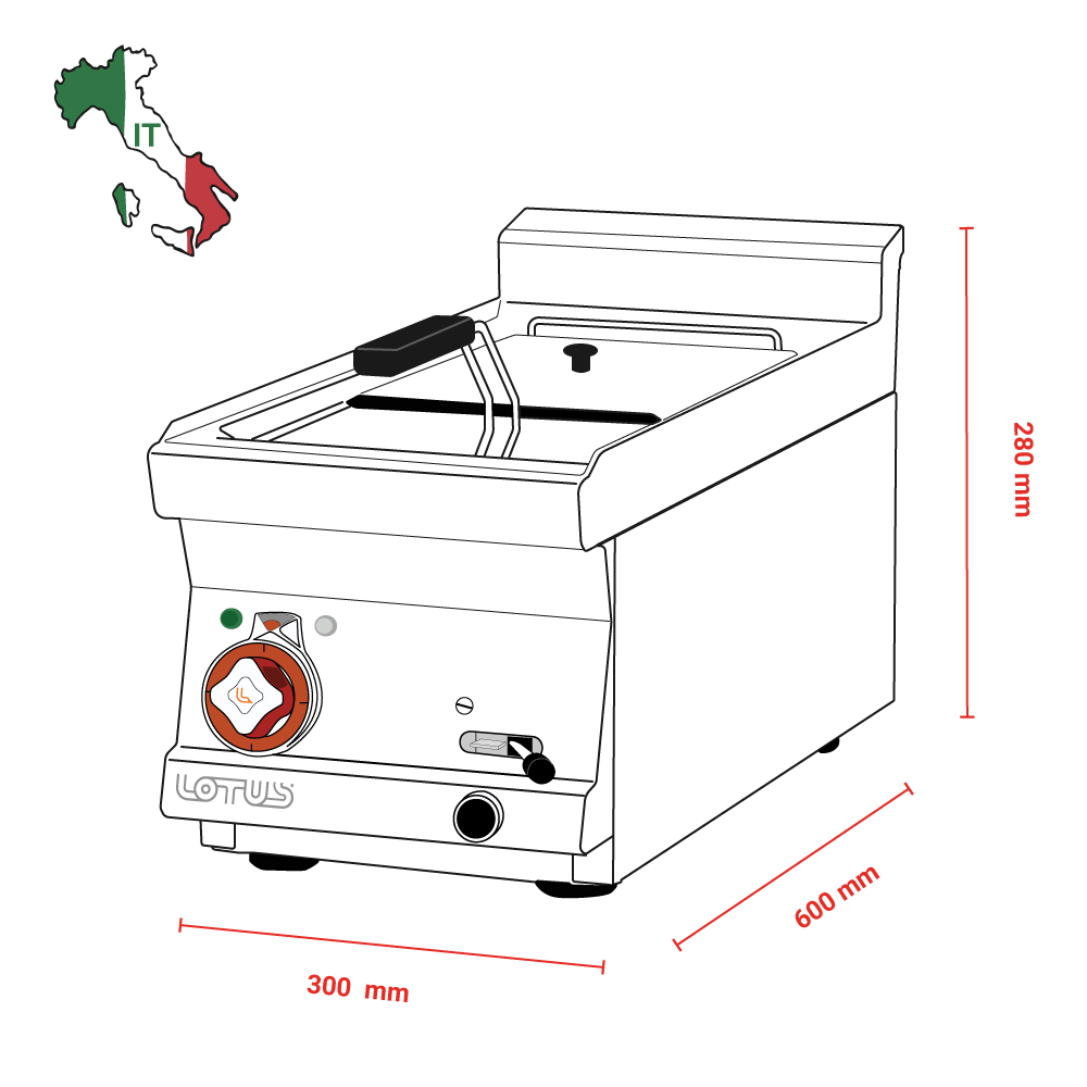 Φριτέζα ηλεκτρική μονή, χωρητικότητας 10 lt, του εργοστασίου Lotus Ιταλίας. Κατασκευασμένο με χρήση ανοξείδωτου χάλυβα ποιότητας (CrNi 18/10 AISI 304) , με διακόπτες αδιάβροχης ποιότητας (IPX5).