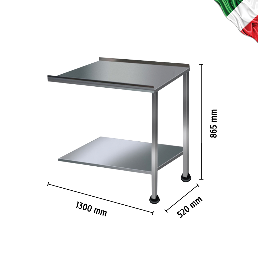 Πλαϊνό τραπέζι εισόδου ή εξόδου (1300x520x865mm) , με επιπρόσθετο ράφι Inox & ρυθμιζόμενα πόδια , κατασκευής INOX AISI 304, του ιταλικού εργοστασίου Silanos.
