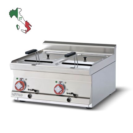 Φριτέζα ηλεκτρική διπλή, χωρητικότητας 13+13 lt, του εργοστασίου Lotus Ιταλίας. Κατασκευασμένο με χρήση ανοξείδωτου χάλυβα ποιότητας (CrNi 18/10 AISI 304) , με διακόπτες αδιάβροχης ποιότητας (IPX5).