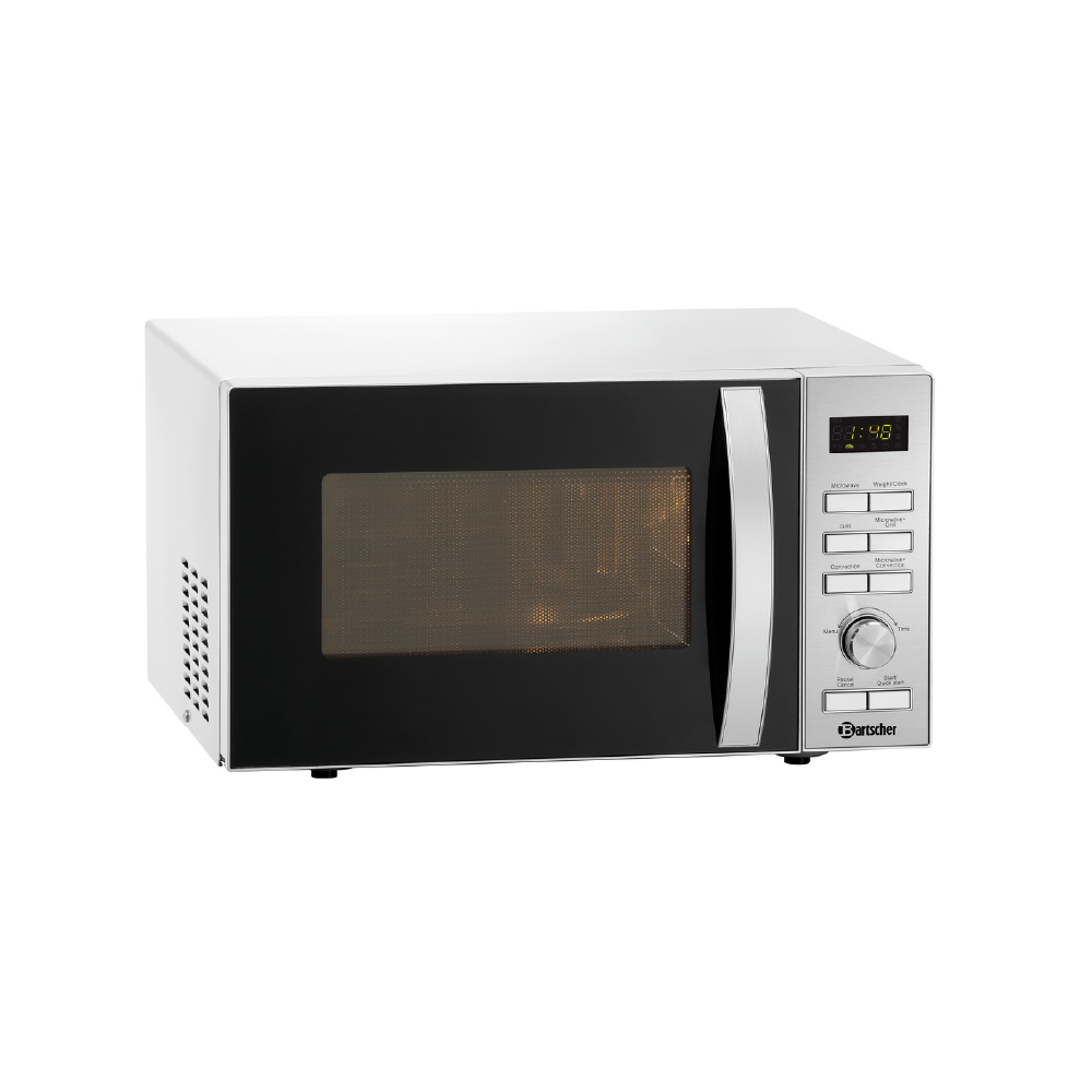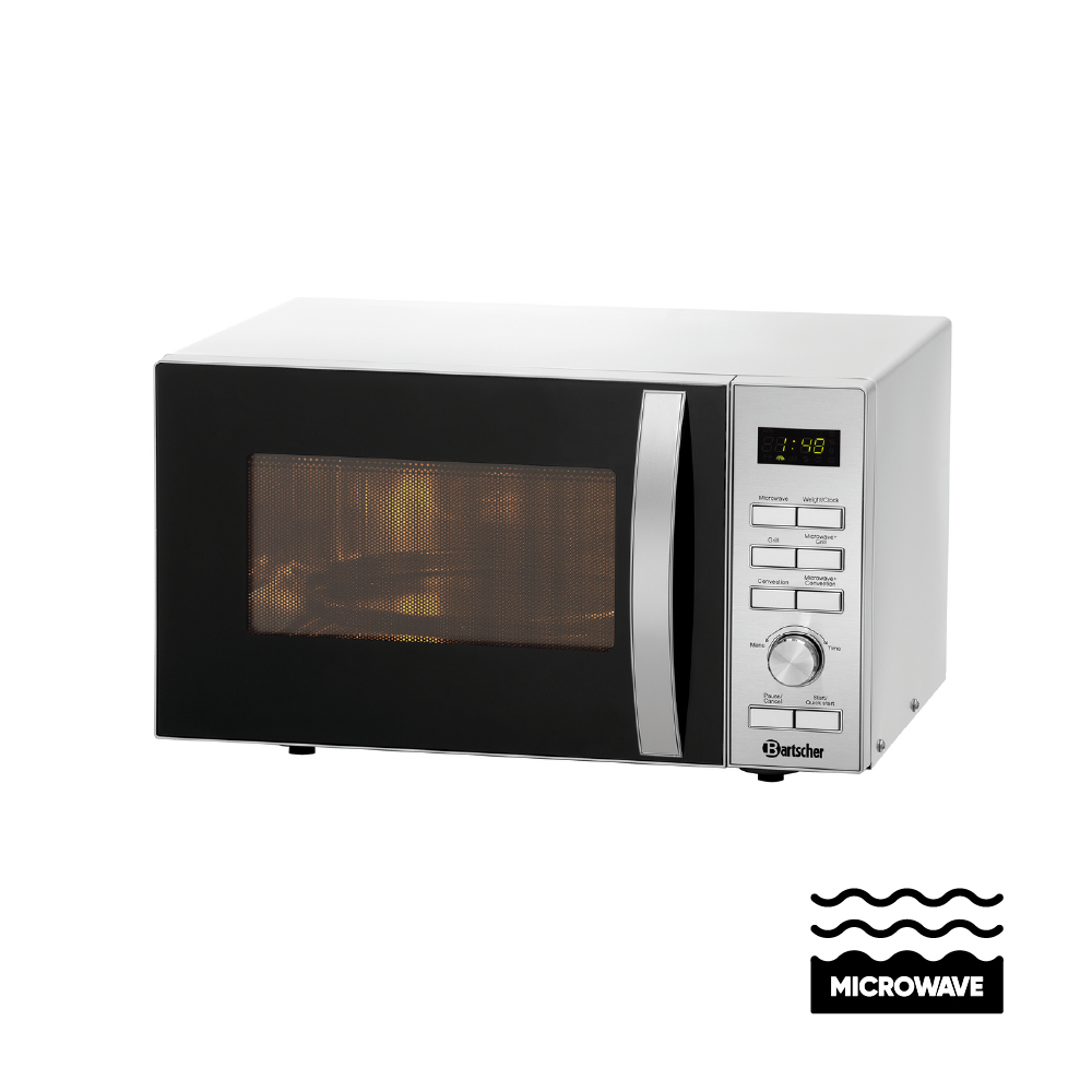 Φούρνος μικροκυμάτων αναλογικός , χωρητικότητας 25 lt , Bartscher Γερμανίας. Με τις πρόσθετες λειτουργίες θερμού αέρα και γκριλ, ο φούρνος μικροκυμάτων προσφέρει μεγάλο εύρος στο είδος της προετοιμασίας φαγητών. Ο χρόνος και η ισχύς μπορούν να ρυθμιστούν μεμονωμένα ανάλογα με τη λειτουργία σύμφωνα με τις ανάγκες σας.