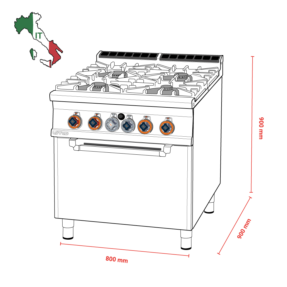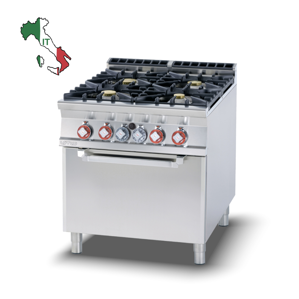 Κουζίνα αερίου 4 εστιών με φούρνο ηλεκτρικό στατικό , του εργοστασίου Lotus.Κατασκευασμένο με χρήση ανοξείδωτου χάλυβα ποιότητας (CrNi 18/10 AISI 304) , με διακόπτες αδιάβροχης ποιότητας (IPX5).