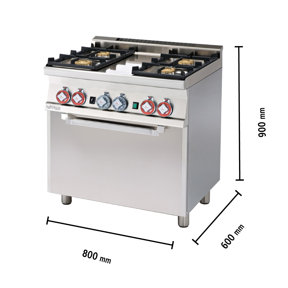 Κουζίνα αερίου 4 εστιών με φούρνο αερίου στατικό & grill , του εργοστασίου Lotus Ιταλίας. Κατασκευασμένο με χρήση ανοξείδωτου χάλυβα ποιότητας (CrNi 18/10 AISI 304) , με διακόπτες αδιάβροχης ποιότητας (IPX5).