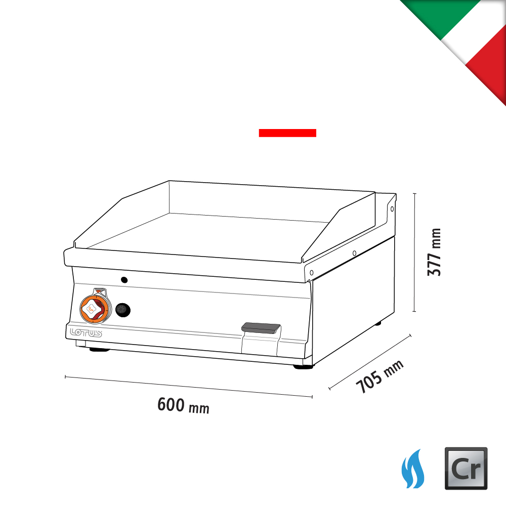 Πλατώ αερίου μεσαίο λείο χρωμίου , του εργοστασίου Lotus Ιταλίας. Κατασκευασμένο με χρήση ανοξείδωτου χάλυβα ποιότητας (CrNi 18/10 AISI 304) , με διακόπτες αδιάβροχης ποιότητας (IPX5).