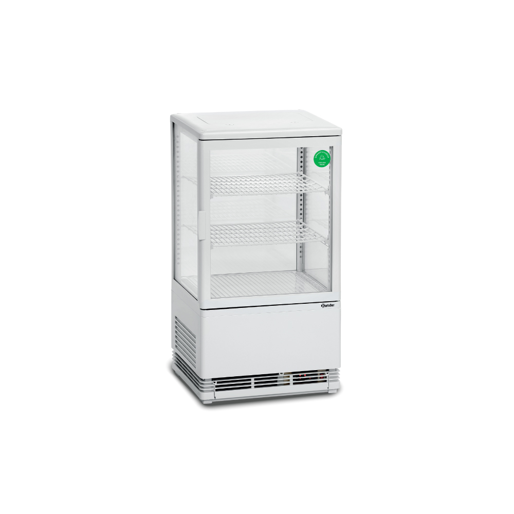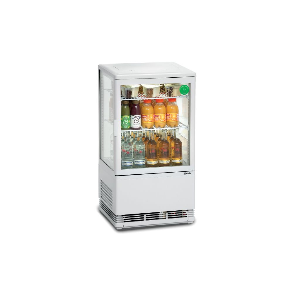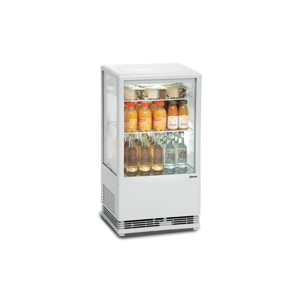 Επιτραπέζια πανοραμική βιτρίνα συντήρησης , χωρητικότητας 58 lt. Προμηθευτής : Bartscher Η συμπαγής ψυχόμενη βιτρίνα σε λευκή έκδοση με χωρητικότητα 58 λίτρα θα σας πείσει με το φιλικό προς το περιβάλλον ψυκτικό μέσο και την ισχυρή έκδοση με μεγάλη διάρκεια ζωής.