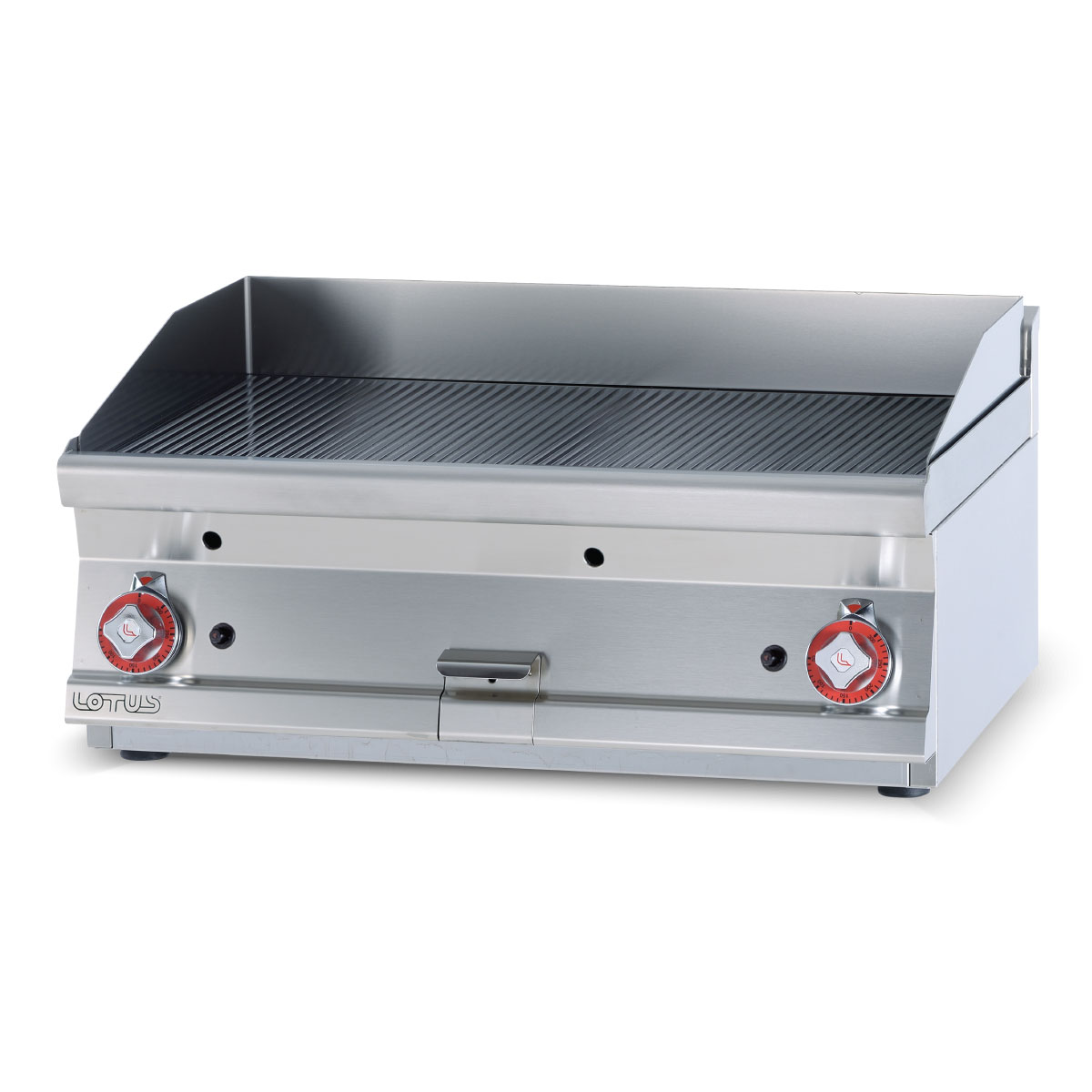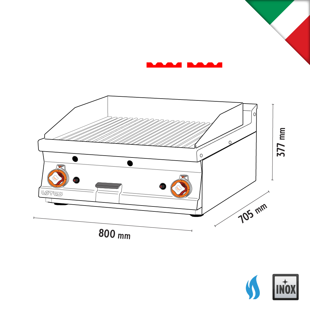 Πλατώ αερίου διπλό ραβδωτό , του εργοστασίου Lotus Ιταλίας. Κατασκευασμένο με χρήση ανοξείδωτου χάλυβα ποιότητας (CrNi 18/10 AISI 304) , με διακόπτες αδιάβροχης ποιότητας (IPX5).