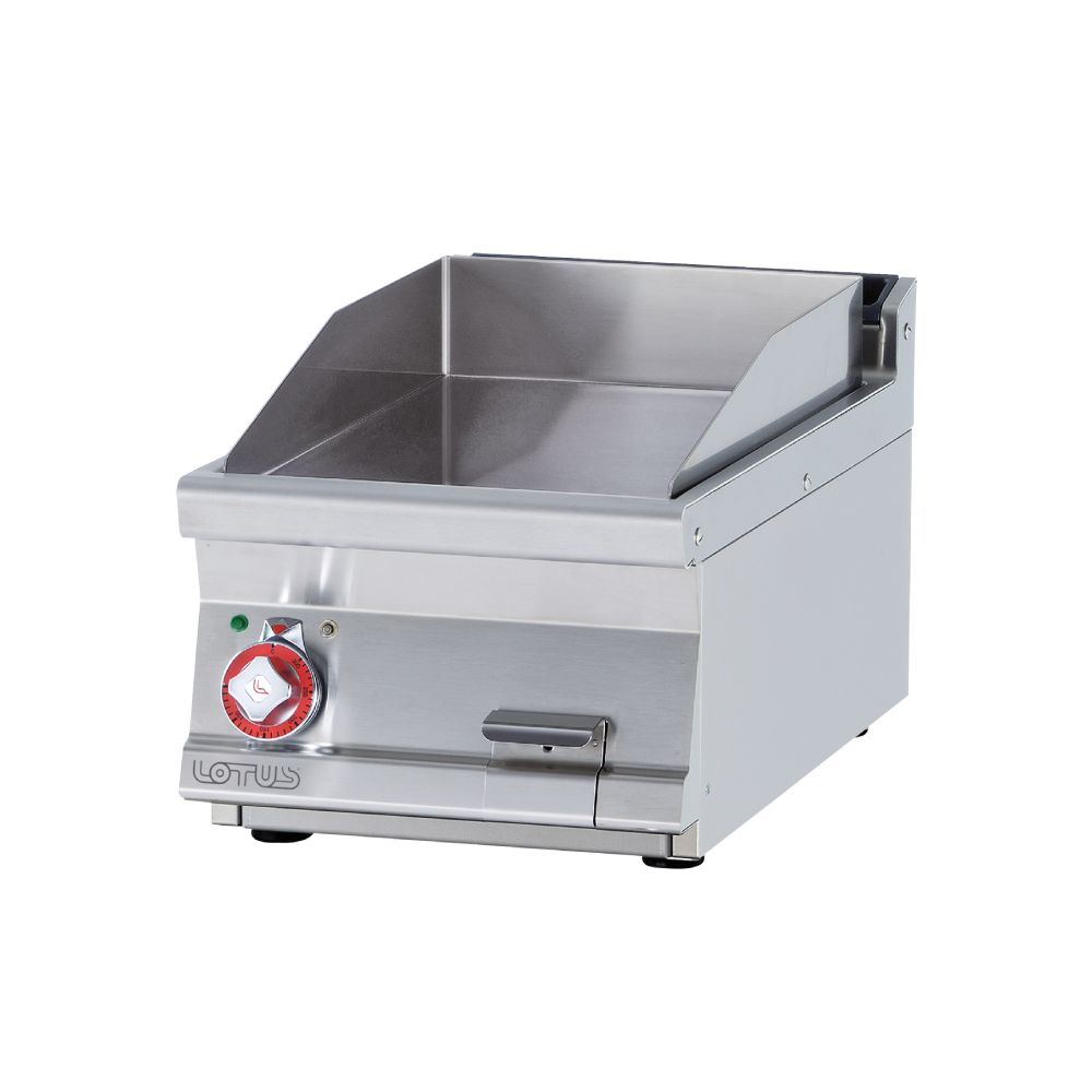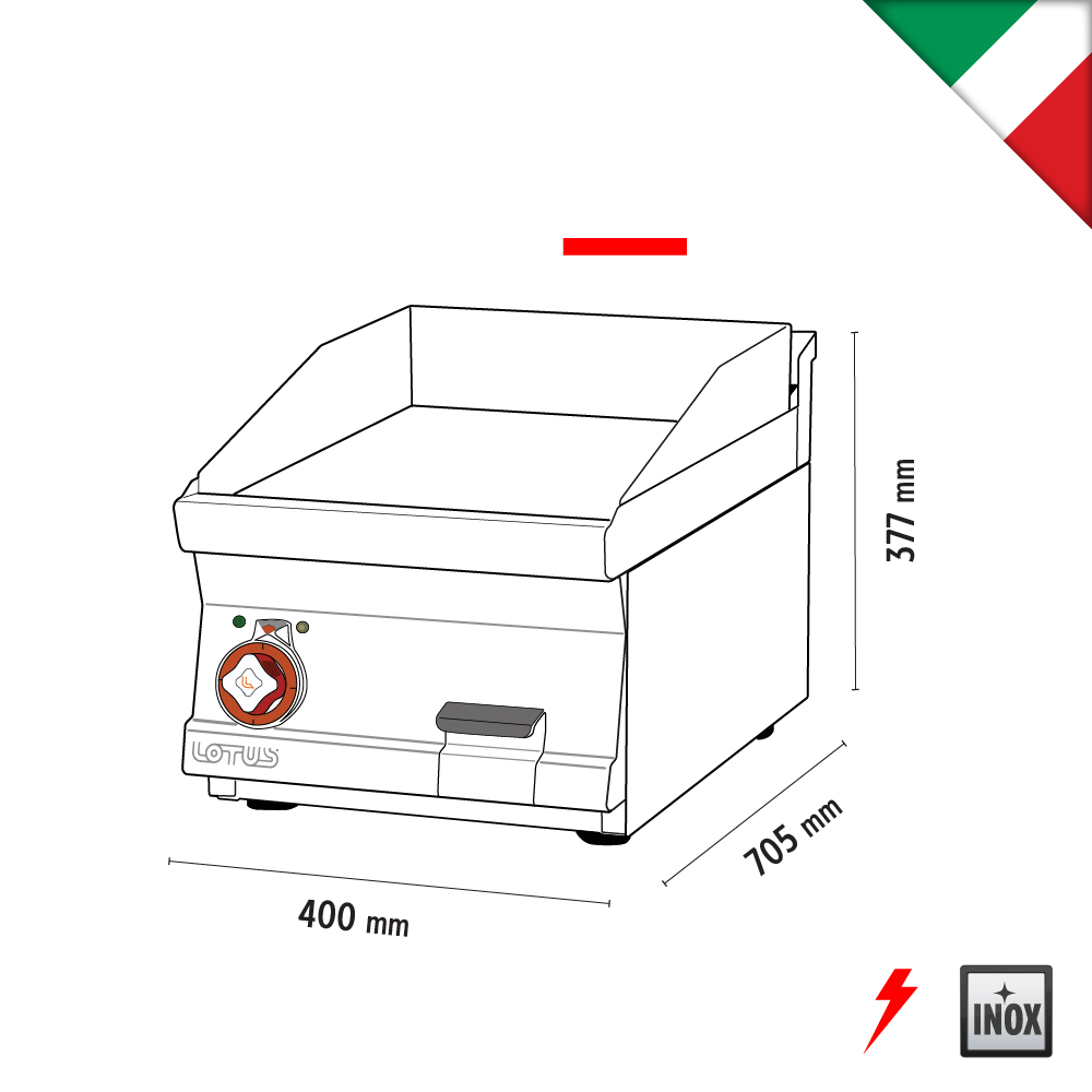 Πλατώ ηλεκτρικό μονό λείο, του εργοστασίου Lotus Ιταλίας. Κατασκευασμένο με χρήση ανοξείδωτου χάλυβα ποιότητας (CrNi 18/10 AISI 304) , με διακόπτες αδιάβροχης ποιότητας (IPX5).