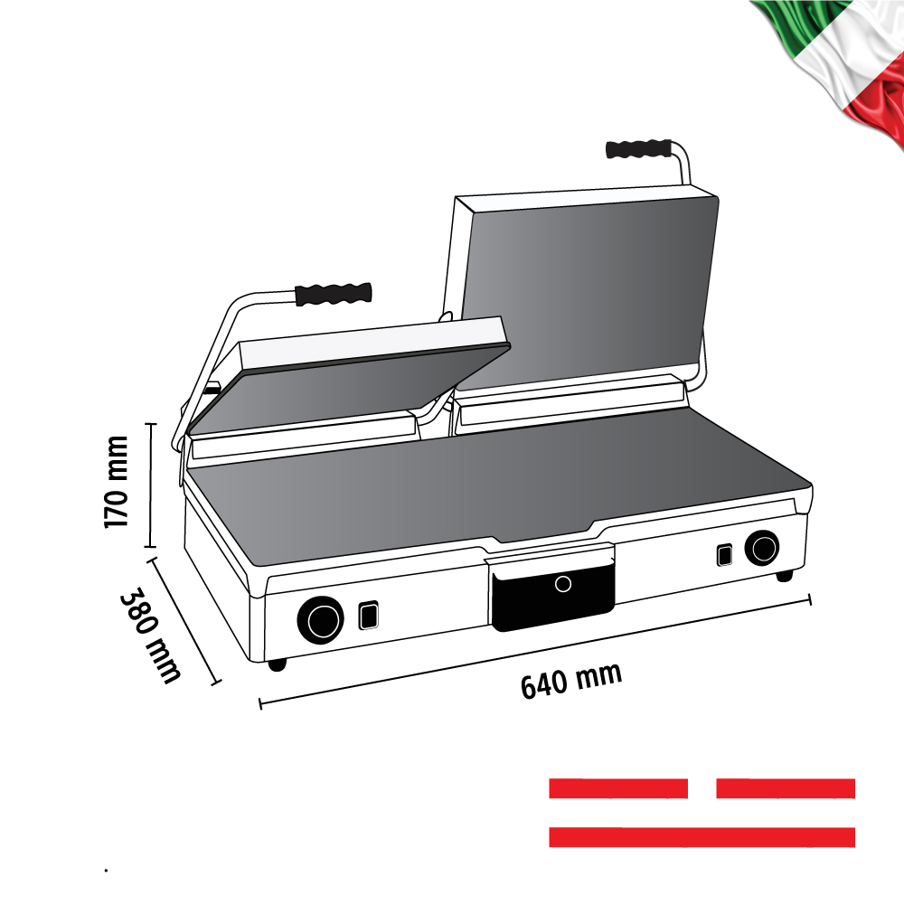 Τοστιέρα διπλή λεία πάνω & κάτω , Milantoast Ιταλίας. Επαγγελματική τοστιέρα μαντεμένια , με δομή από ανοξείδωτο χάλυβα και αντικολλητικές πλάκες από χυτοσίδηρο, κατασκευασμένη με ειδική επιφανειακή κεραμική επίστρωση που κάνει τις πλάκες ιδιαίτερα ανθεκτικές στα οξέα, το αλάτι και τη διάβρωση, ενώ επιτρέπει τον εύκολο και γρήγορο καθαρισμό. Οι αντικολλητικές πλάκες από χυτοσίδηρο είναι γνωστές για τις ιδιότητες συγκράτησης της θερμότητας και επιτρέπουν γρήγορους χρόνους θέρμανσης και εξαιρετική διατήρηση της θερμότητας ώστε να προσφέρουν τα εξαιρετικά και σταθερά αποτελέσματα μαγειρέματος που απαιτούνται για μια γρήγορη παρασκευή φαγητού. Η τοστιέρα 16053 της Milantoast είναι η ιδανική επιλογή για εστιατόρια και καφετέριες καθώς είναι πολύ εύκολη στη χρήση με την αυτοεξισορροπούμενη επάνω πλάκα της με ρυθμιζόμενη πίεση κλεισίματος στο πάχος του φαγητού και την αποστράγγιση λίπους στο κάτω μέρος.