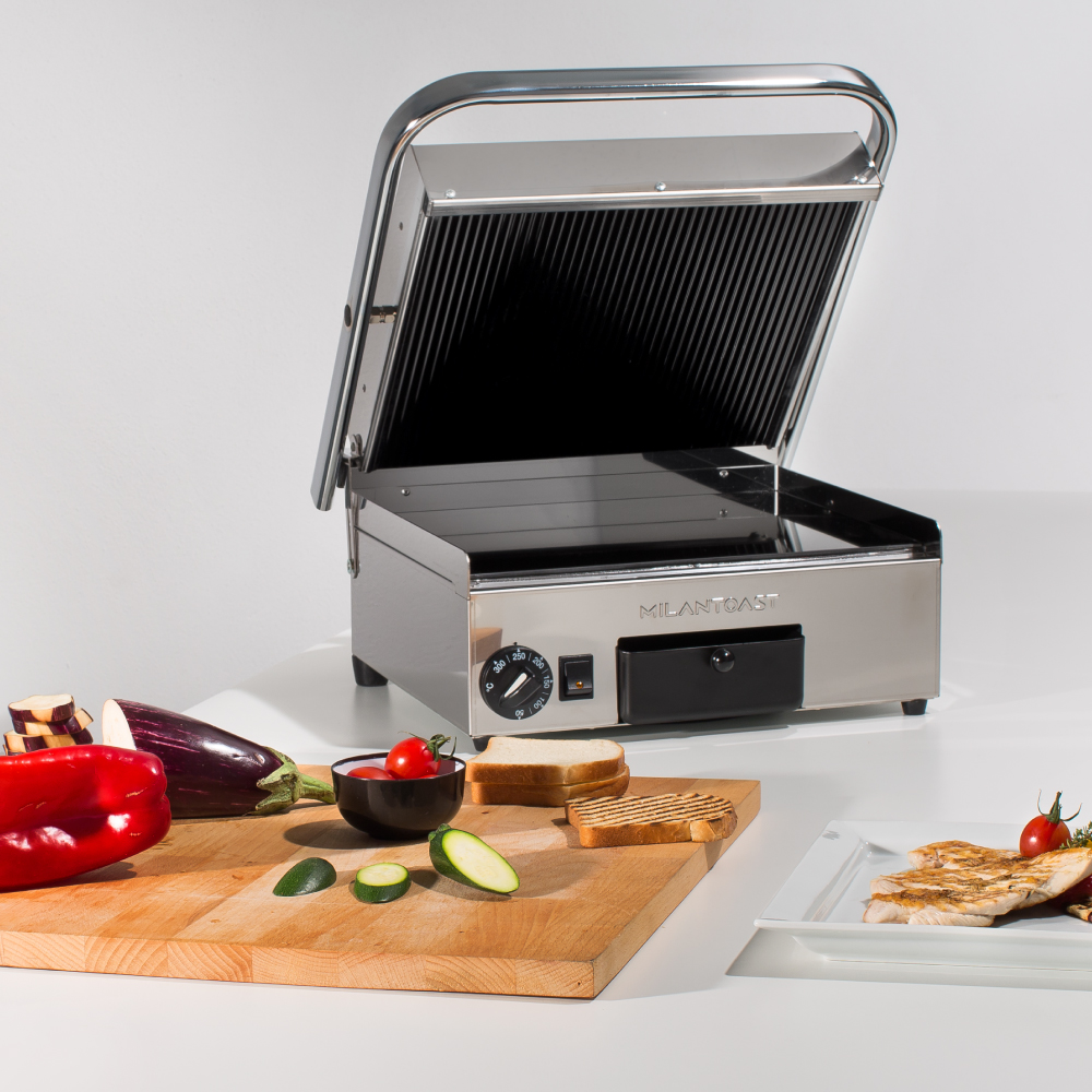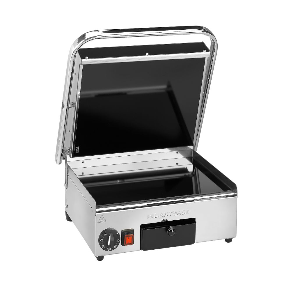 Τοστιέρα μεσαία κεραμική λεία πάνω – κάτω, Milantoast Ιταλίας. Επαγγελματική τοστιέρα με χοντρές γυάλινες κεραμικές πλάκες μαγειρέματος με υψηλή θερμική αντοχή και δομή από ανοξείδωτο χάλυβα που εγγυάται μεγάλη διάρκεια ζωής, μεγάλη επιφάνεια ψησίματος και πολύ υψηλή ταχύτητα θέρμανσης χάρη στα ισχυρά υπέρυθρα στοιχεία (πάνω από 300°C σε 3 λεπτά) για μεγαλύτερη απόδοση κατά το μαγείρεμα. Το κύριο πλεονέκτημα του κεραμικού φινιρίσματος είναι ο γρήγορος χρόνος θέρμανσης.  Αμετάβλητη γεύση: Η επιφάνεια δεν απορροφά τη γεύση του φαγητού και σας επιτρέπει να μαγειρεύετε διαφορετικά προϊόντα το ένα μετά το άλλο χωρίς μεταφορά γεύσης Εύκολο στη χρήση: με ρύθμιση θερμοκρασίας με θερμοστάτη από ανοξείδωτο χάλυβα, διακόπτη on/off με ενδεικτική λυχνία και εργονομικό κουμπί μαλακής αφής. Χαμηλή κατανάλωση ενέργειας: χάρη στο αποδοτικό σύστημα θέρμανσης και την εξαιρετική μόνωση, εξοικονόμηση έως και 60% στην κατανάλωση ενέργειας σε ετήσια βάση. Ομοιόμορφη θερμότητα: Η θερμότητα κατανέμεται ομοιόμορφα στην επιφάνεια μαγειρέματος. Εύκολο στο καθάρισμα: αυτή κεραμική τοστιέρα καθαρίζεται εξαιρετικά εύκολα χάρη στο αντικολλητικό γυάλινο κεραμικό υλικό που την καθιστά κατάλληλη για το μαγείρεμα αυγών, λαχανικών, κρέατος και ψαριών, με την ξύστρα καθαρισμού που παρέχεται.