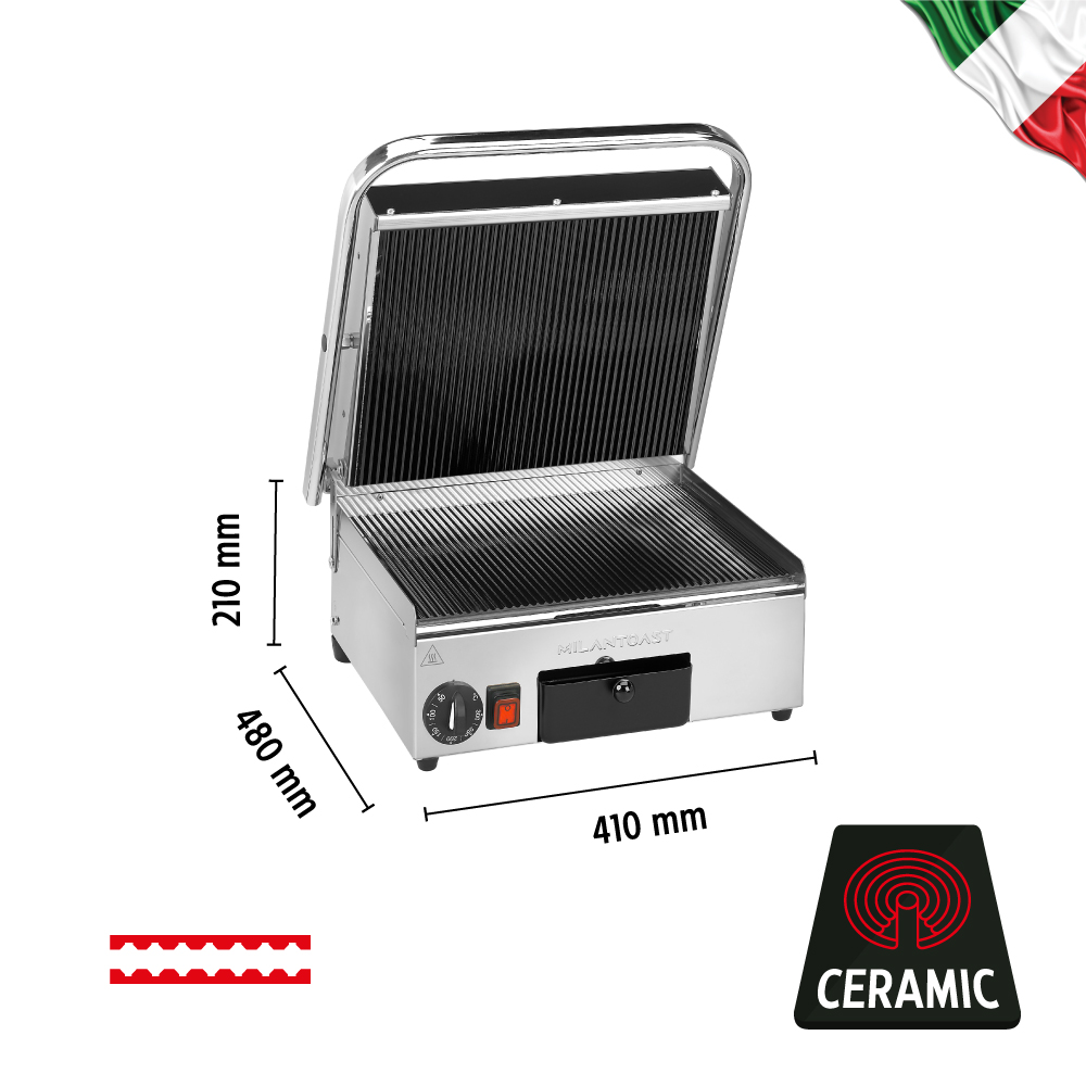 Τοστιέρα μεσαία κεραμική ραβδωτή πάνω – κάτω, Milantoast Ιταλίας. Επαγγελματική τοστιέρα με χοντρές γυάλινες κεραμικές πλάκες μαγειρέματος με υψηλή θερμική αντοχή και δομή από ανοξείδωτο χάλυβα που εγγυάται μεγάλη διάρκεια ζωής, μεγάλη επιφάνεια ψησίματος και πολύ υψηλή ταχύτητα θέρμανσης χάρη στα ισχυρά υπέρυθρα στοιχεία (πάνω από 300°C σε 3 λεπτά) για μεγαλύτερη απόδοση κατά το μαγείρεμα. Το κύριο πλεονέκτημα του κεραμικού φινιρίσματος είναι ο γρήγορος χρόνος θέρμανσης.  Αμετάβλητη γεύση: Η επιφάνεια δεν απορροφά τη γεύση του φαγητού και σας επιτρέπει να μαγειρεύετε διαφορετικά προϊόντα το ένα μετά το άλλο χωρίς μεταφορά γεύσης Εύκολο στη χρήση: με ρύθμιση θερμοκρασίας με θερμοστάτη από ανοξείδωτο χάλυβα, διακόπτη on/off με ενδεικτική λυχνία και εργονομικό κουμπί μαλακής αφής. Χαμηλή κατανάλωση ενέργειας: χάρη στο αποδοτικό σύστημα θέρμανσης και την εξαιρετική μόνωση, εξοικονόμηση έως και 60% στην κατανάλωση ενέργειας σε ετήσια βάση. Ομοιόμορφη θερμότητα: Η θερμότητα κατανέμεται ομοιόμορφα στην επιφάνεια μαγειρέματος. Εύκολο στο καθάρισμα: αυτή κεραμική τοστιέρα καθαρίζεται εξαιρετικά εύκολα χάρη στο αντικολλητικό γυάλινο κεραμικό υλικό που την καθιστά κατάλληλη για το μαγείρεμα αυγών, λαχανικών, κρέατος και ψαριών, με την ξύστρα καθαρισμού που παρέχεται.