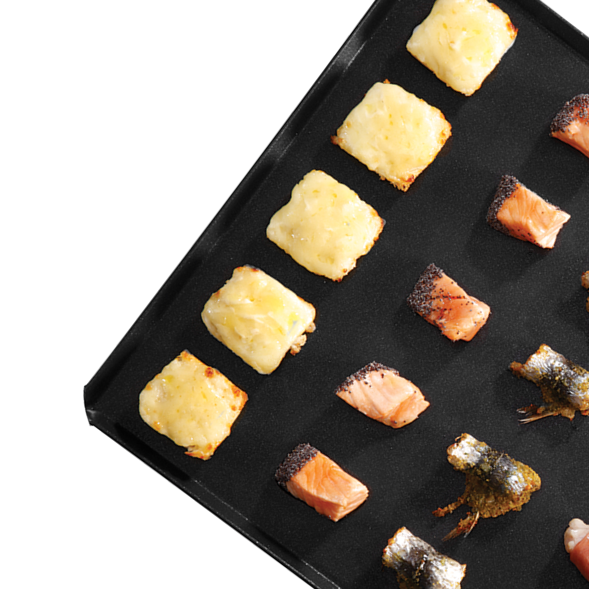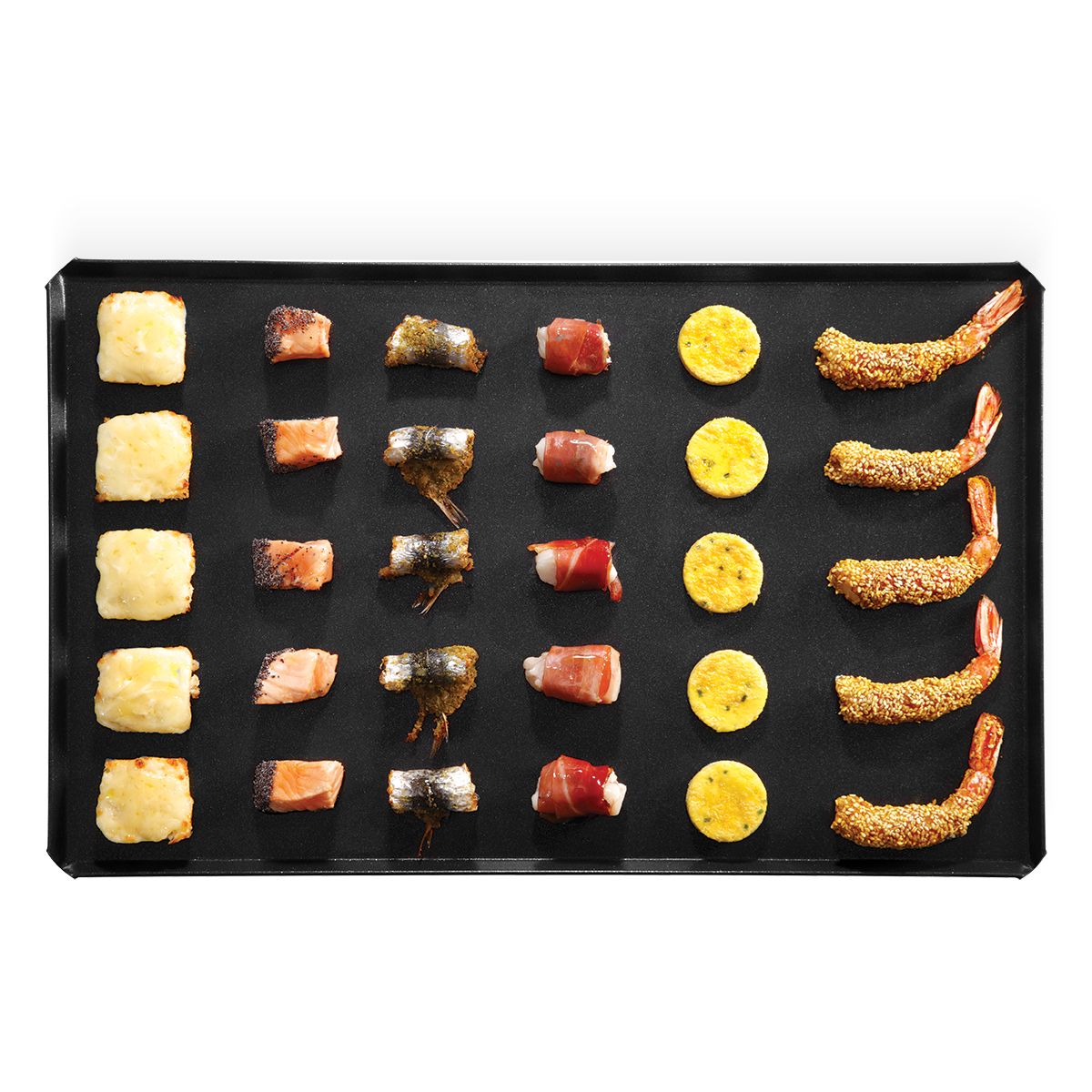 Λείο ταψί από κράμα αλουμινίου που έχει υποστεί επεξεργασία με teflon , με ανοιχτά άκρα , του εργοστασίου Lainox.