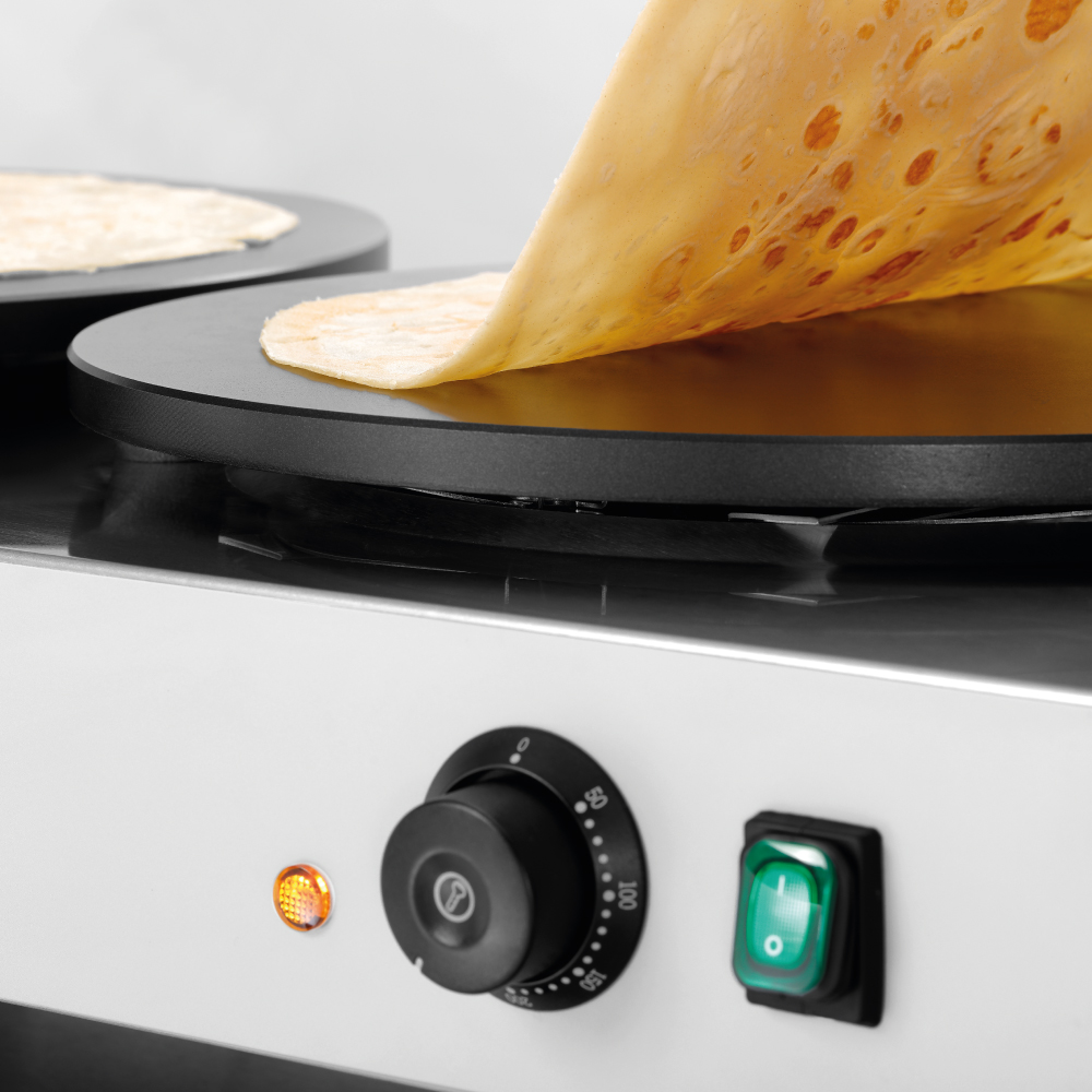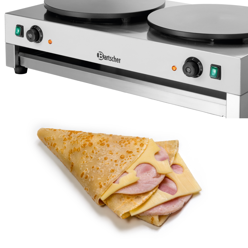 Κρεπιέρα διπλή ηλεκτρική (6kWatt) , Bartscher Γερμανίας. Οι αποδοτικές πλάκες της κρεπιέρας από χυτοσίδηρο μαρτυρούν την καλή θερμική αγωγιμότητα και την ανθεκτική κατασκευή. Επιπλέον οι πλάκες μπορούν να ενεργοποιηθούν μεμονωμένα και έτσι καθιστούν δυνατή την ανεξάρτητη χρήση τους ανάλογα με τις απαιτήσεις της επιχειρησής σας.