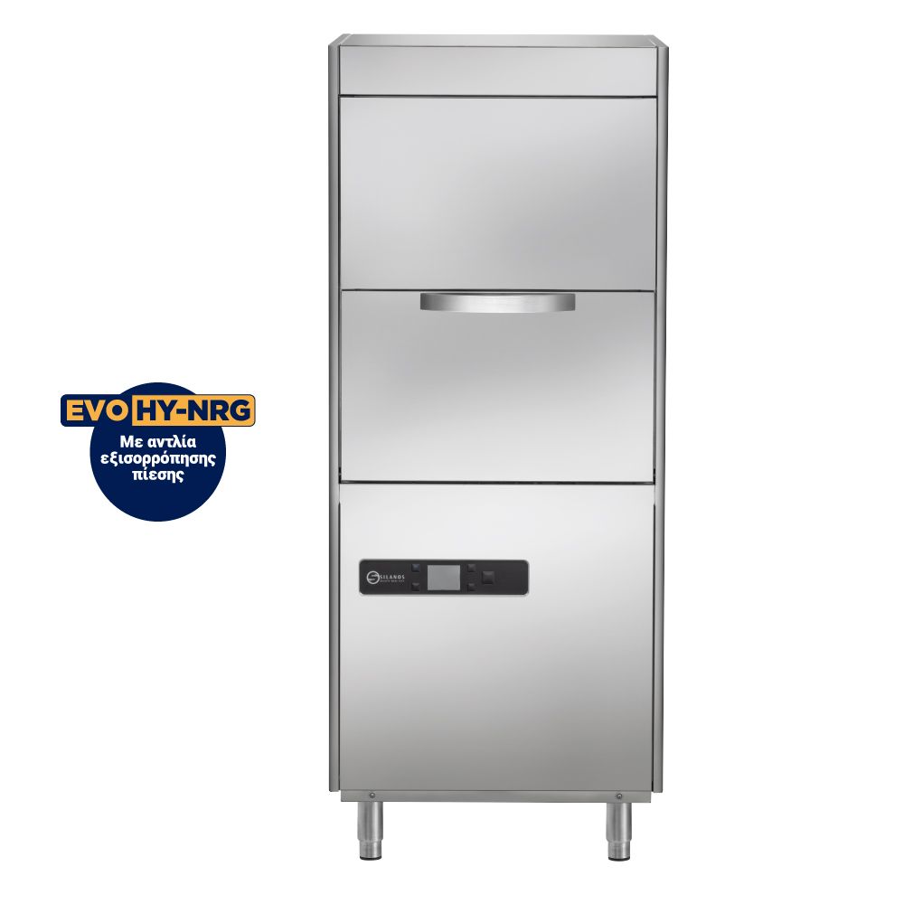 Επαγγελματικό πλυντήριο σκευών , εξ όλοκλήρου Inox , με διπλά τοιχώματα , του ιταλικού εργοστασίου Silanos. Το σύστημα HY-NRG δεν επιτρέπει στο κρύο νερό του δικτύου να μπεί στο Boiler κατά την διάρκεια της απόπλυσης.Έτσι τα σκεύη έρχονται σε επαφή μόνο με ζεστό νερό και τα αποτελέσματα της απόπλυσης είναι άριστα.Η ενσωματωμένη αντλία απόπλυσης στέλνει πάντα στους βραχίονες νερό σε συγκεκριμένη  και σταθερή πιέση ανεξάρτητα από την πίεση του δικτύου ύδρευσης.Το σύστημα HY-NRG απότελείται από αντλία εξισορρόπησης πιέσης , Break Tank (patened) και ατμοσφαιρικό Boiler. Περιλαμβάνεται 1 καλάθι πιάτων 24 θέσεων , 1 καλάθι γενικής χρήσης & 1 καλάθι για λαμαρίνες 9 θέσεων.