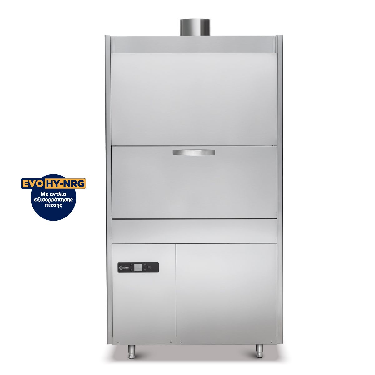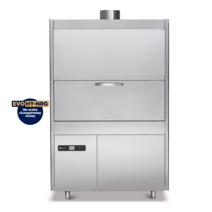 Επαγγελματικό πλυντήριο σκευών , εξ όλοκλήρου Inox , με διπλά τοιχώματα, του ιταλικού εργοστασίου Silanos. Το σύστημα HY-NRG δεν επιτρέπει στο κρύο νερό του δικτύου να μπεί στο Boiler κατά την διάρκεια της απόπλυσης.Έτσι τα σκεύη έρχονται σε επαφή μόνο με ζεστό νερό και τα αποτελέσματα της απόπλυσης είναι άριστα.Η ενσωματωμένη αντλία απόπλυσης στέλνει πάντα στους βραχίονες νερό σε συγκεκριμένη και σταθερή πιέση ανεξάρτητα από την πίεση του δικτύου ύδρευσης.Το σύστημα HY-NRG απότελείται από αντλία εξισορρόπησης πιέσης , Break Tank (patened) και ατμοσφαιρικό Boiler.
