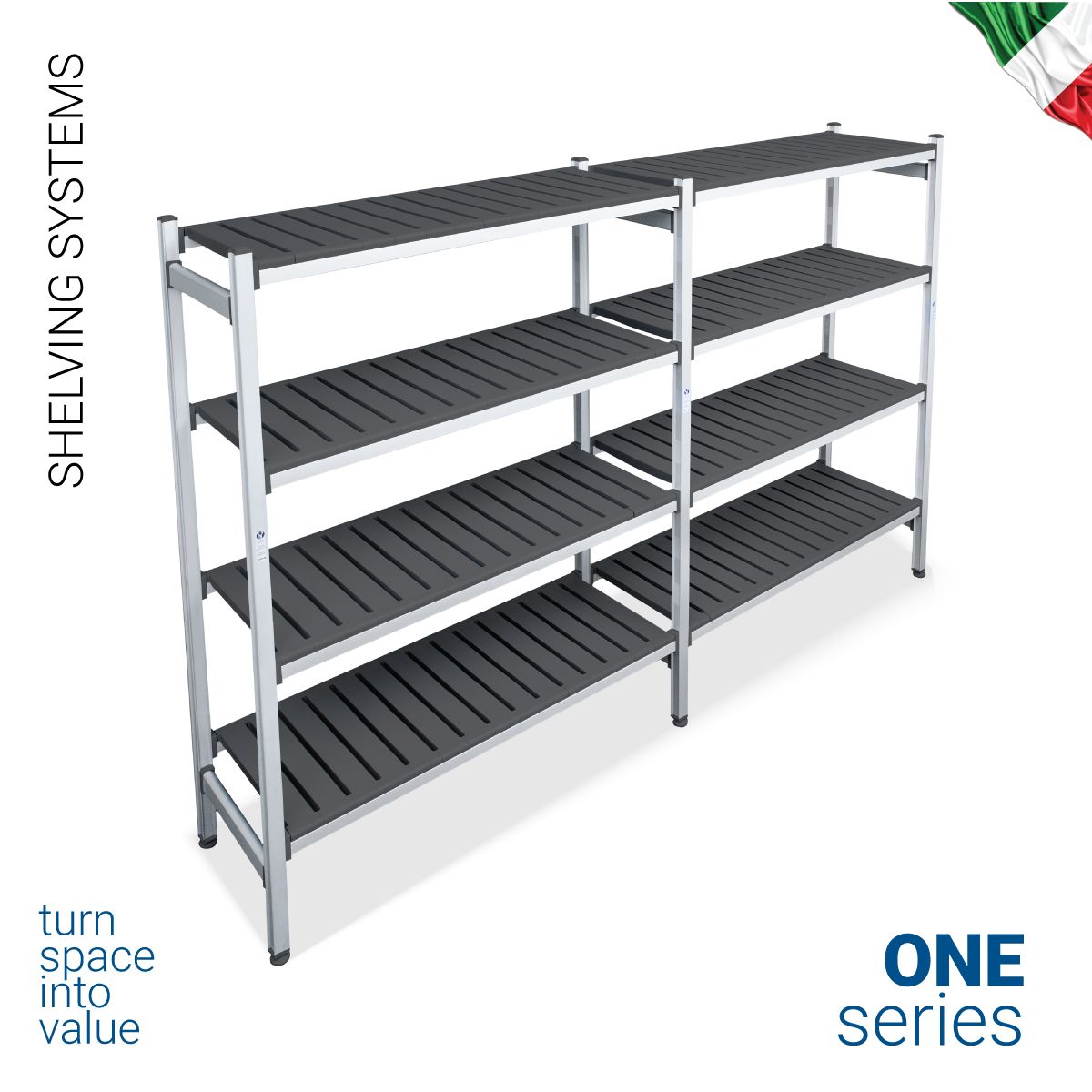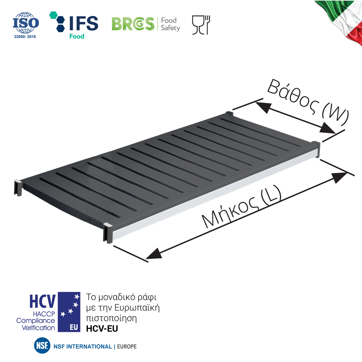 Σύστημα αποτελούμενο από ορθοστάστες αλουμινίου & ράφια υψηλής πυκνότητας πρωτογενούς πολυαιθυλένιου , Tonon Ιταλίας. NSF : Διεθνές πιστοποιητικό ποιότητας Κατασκευή από ανοδιώμενο αλουμίνιο , εγγύηση κατά της σκουριάς. Θερμοκρασίες χρήσης από -30°C μέχρι +90°C. Μέγιστο πιστοποιημένο βάρος φόρτωσης 250Kg ανά επίπεδο φορτίου. Easy Clean : Εύκολος καθαρισμός. Συναρμολόγηση χωρίς ειδικά εργαλεία , εύκολη & γρήγορη με ένα κλίκ. Επιφάνεια ραφιών από πολυαιθυλένιο υψηλής πυκνότητας (High Density). Προσαρμόζεται απόλυτα στο χώρο σας.