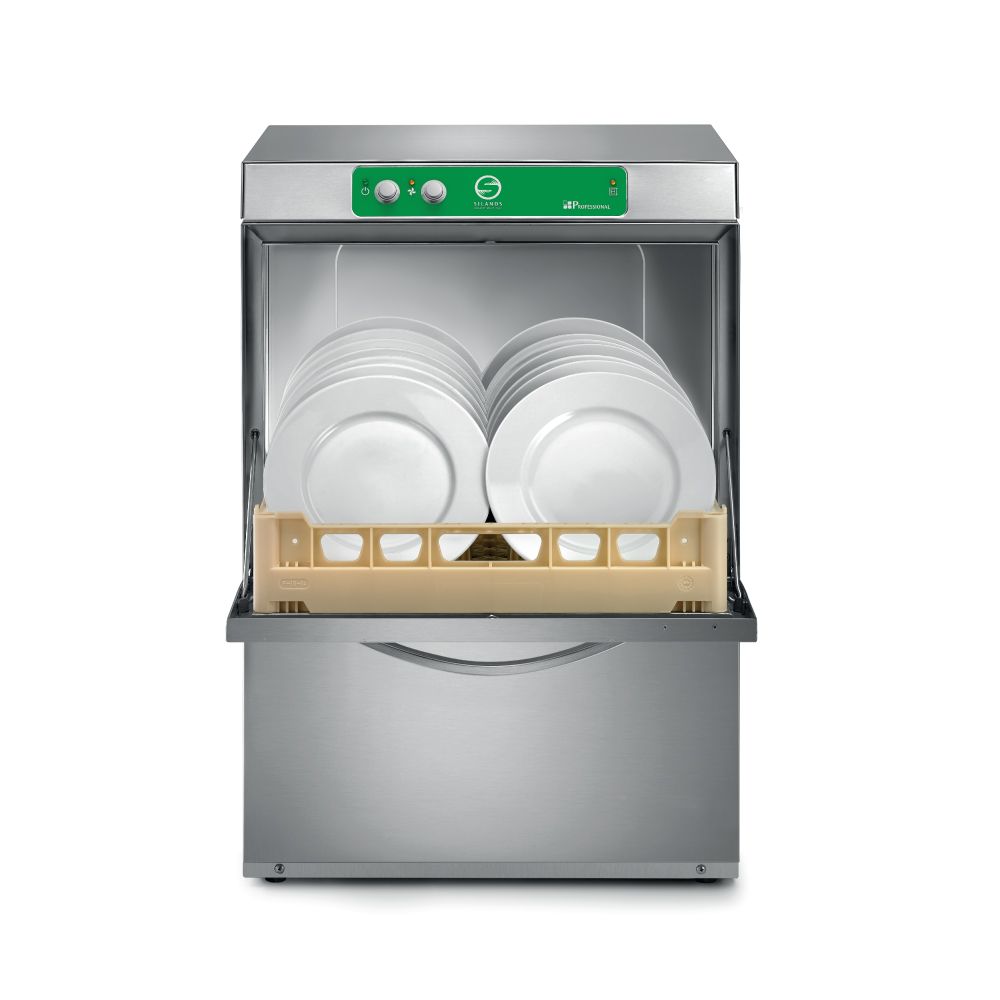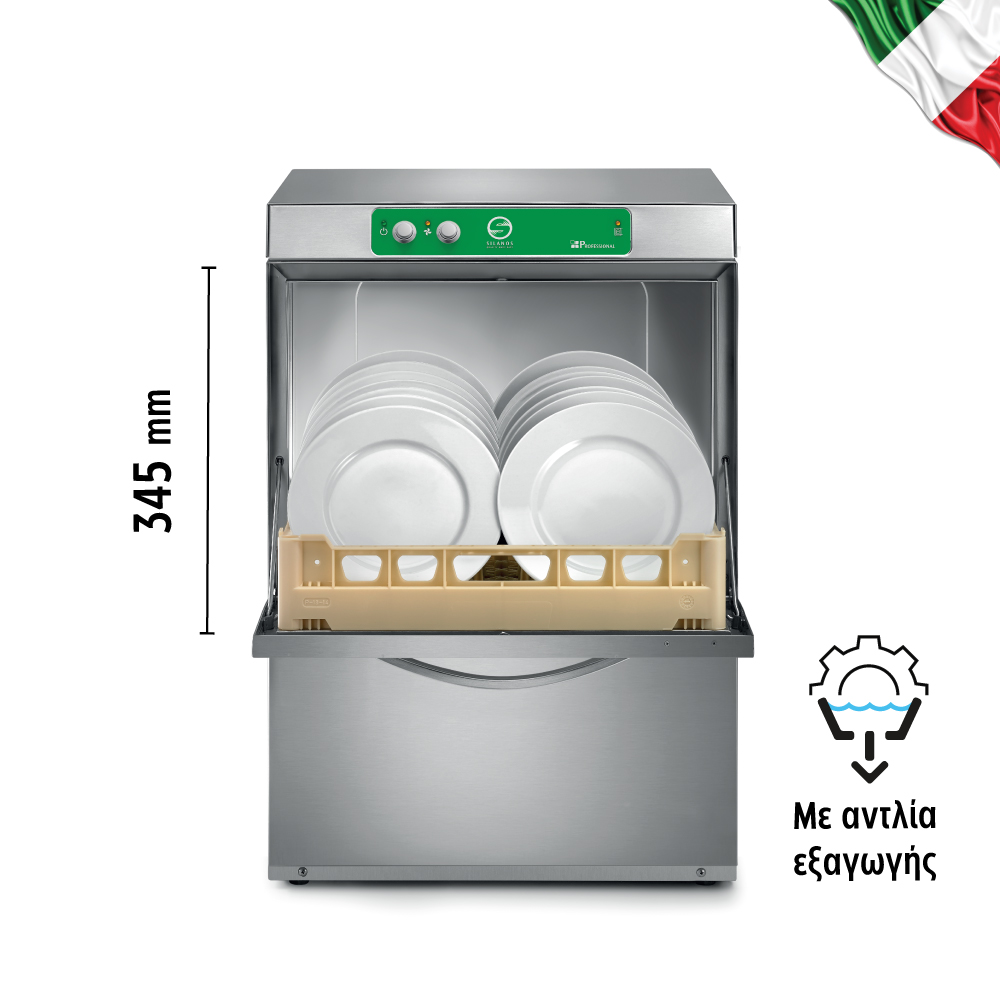 Πλυντήριο ποτηριών-πιάτων με καλάθι 50x50cm & ενσωματωμένη αντλία εξαγωγής , του ιταλικού εργοστασίου Silanos . Συμπεριλαμβάνονται: 1 καλάθι ποτηριών , 1 καλάθι πιάτων & 1 θήκη για μαχαιροπήρουνα.