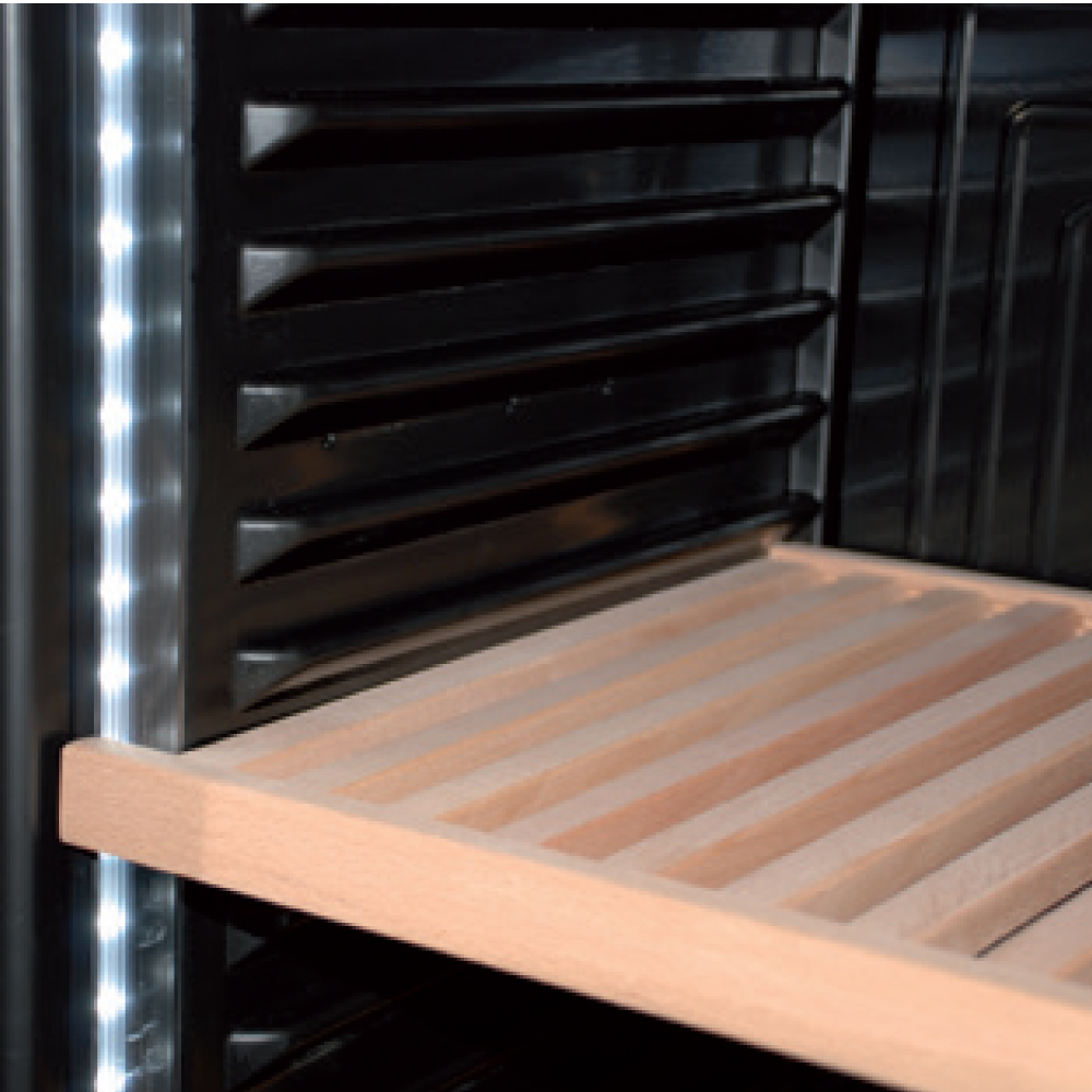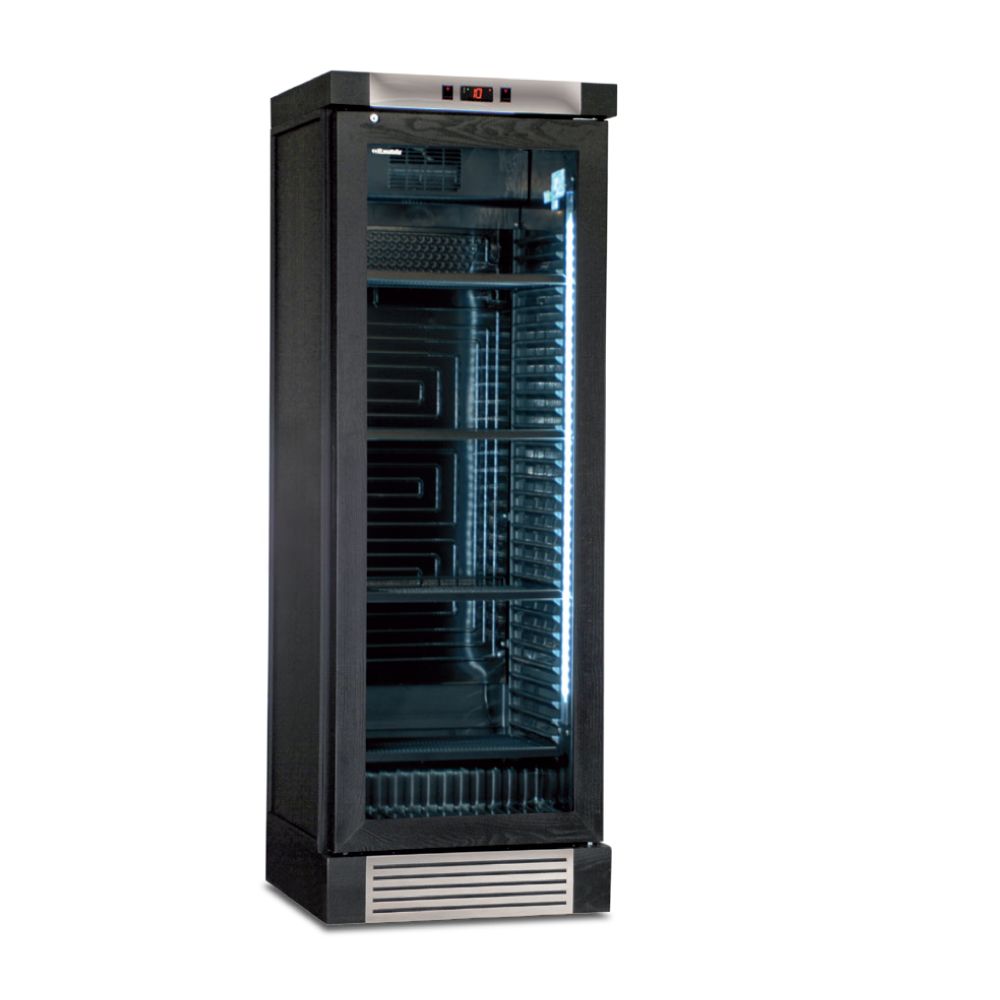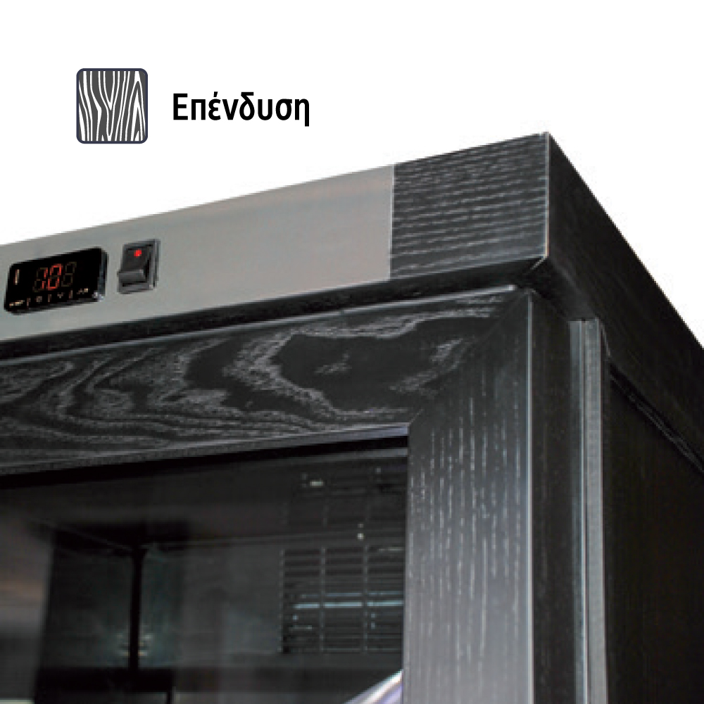 Βιτρίνα κρασιών με ξύλινη μαύρη επένδυση , χωρητικότητας 382 lt . Προμηθευτής :KlimaItalia