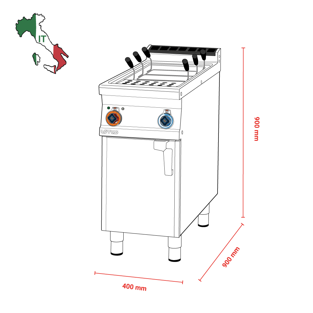 Επιδαπέδιος βραστήρας ζυμαρικών ηλεκτρικός , χωρητικότητας 40 lt, του εργοστασίου Lotus Ιταλίας. Κατασκευασμένο με χρήση ανοξείδωτου χάλυβα ποιότητας (CrNi 18/10 AISI 304) , με διακόπτες αδιάβροχης ποιότητας (IPX5).