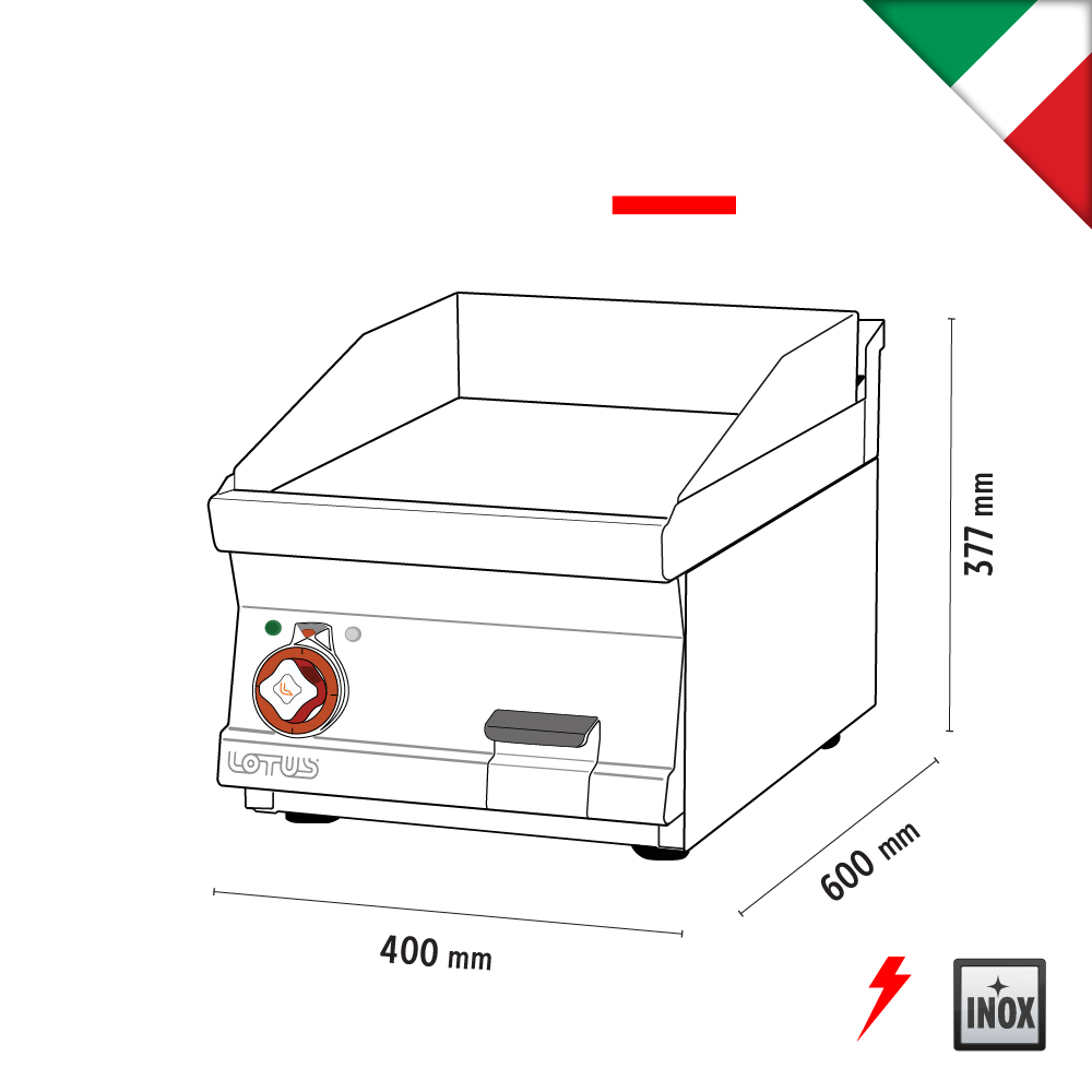Πλατώ ηλεκτρικό μονό λείο, του εργοστασίου Lotus Ιταλίας. Κατασκευασμένο με χρήση ανοξείδωτου χάλυβα ποιότητας (CrNi 18/10 AISI 304) , με διακόπτες αδιάβροχης ποιότητας (IPX5).