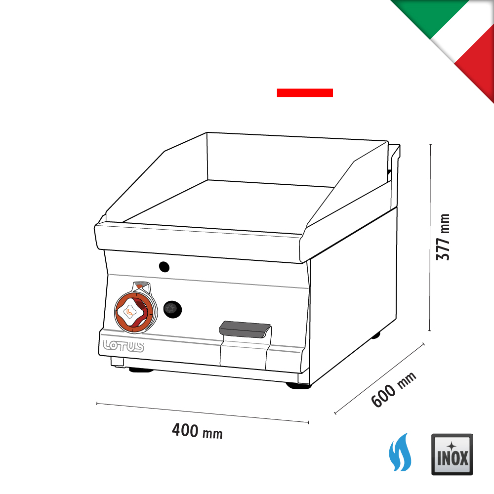 Πλατώ αερίου, μονό λείο, του εργοστασίου Lotus Ιταλίας. Κατασκευασμένο με χρήση ανοξείδωτου χάλυβα ποιότητας (CrNi 18/10 AISI 304) , με διακόπτες αδιάβροχης ποιότητας (IPX5).