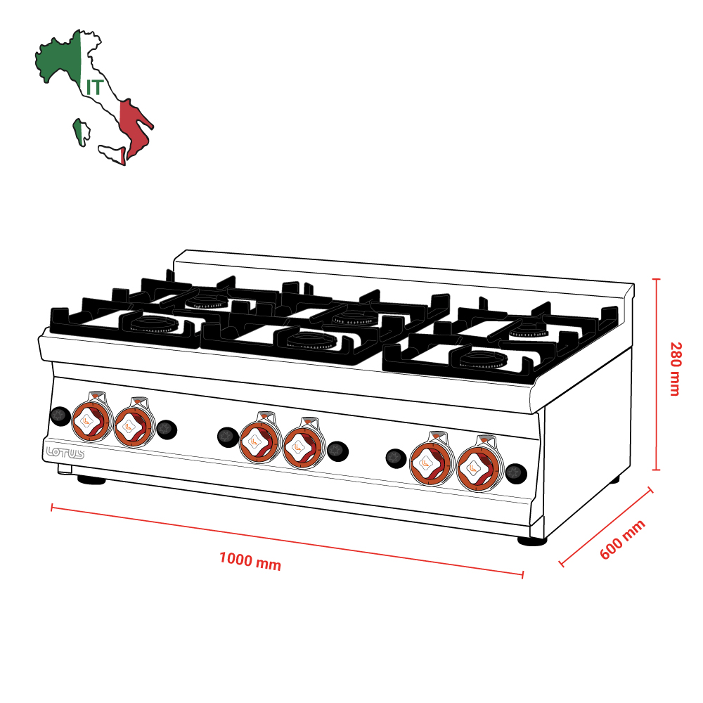 Επιτραπέζια εξαπλή εστία αερίου , του εργοστασίου Lotus. Κατασκευασμένο με χρήση ανοξείδωτου χάλυβα ποιότητας (CrNi 18/10 AISI 304) , με διακόπτες αδιάβροχης ποιότητας (IPX5).