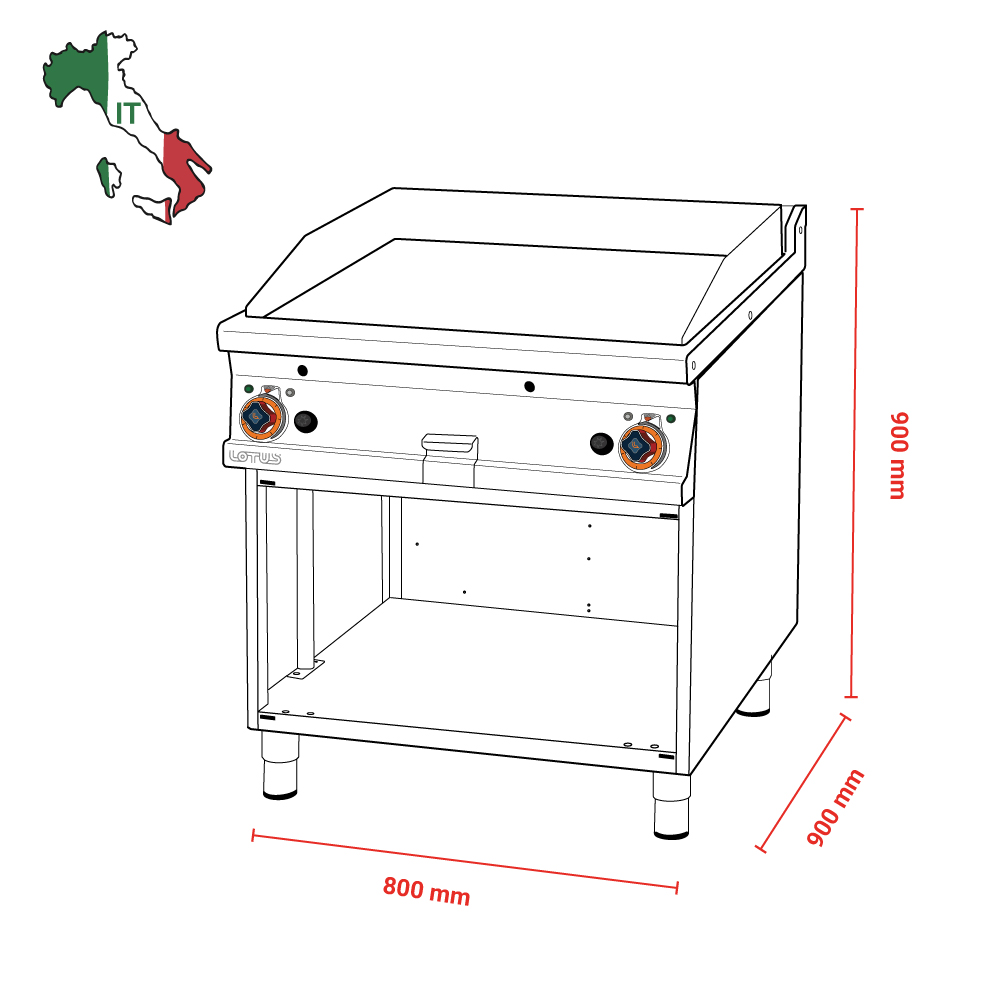 Πλατώ επιδαπέδιο αερίου διπλό λείο , του εργοστασίου Lotus Ιταλίας Κατασκευασμένο με χρήση ανοξείδωτου χάλυβα ποιότητας (CrNi 18/10 AISI 304) , με διακόπτες αδιάβροχης ποιότητας (IPX5).