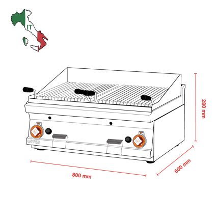 Γκριλιέρα αερίου μονή επιδαπέδια , του εργοστασίου Lotus Ιταλίας. Κατασκευασμένο με χρήση ανοξείδωτου χάλυβα ποιότητας (CrNi 18/10 AISI 304) , με διακόπτες αδιάβροχης ποιότητας (IPX5).