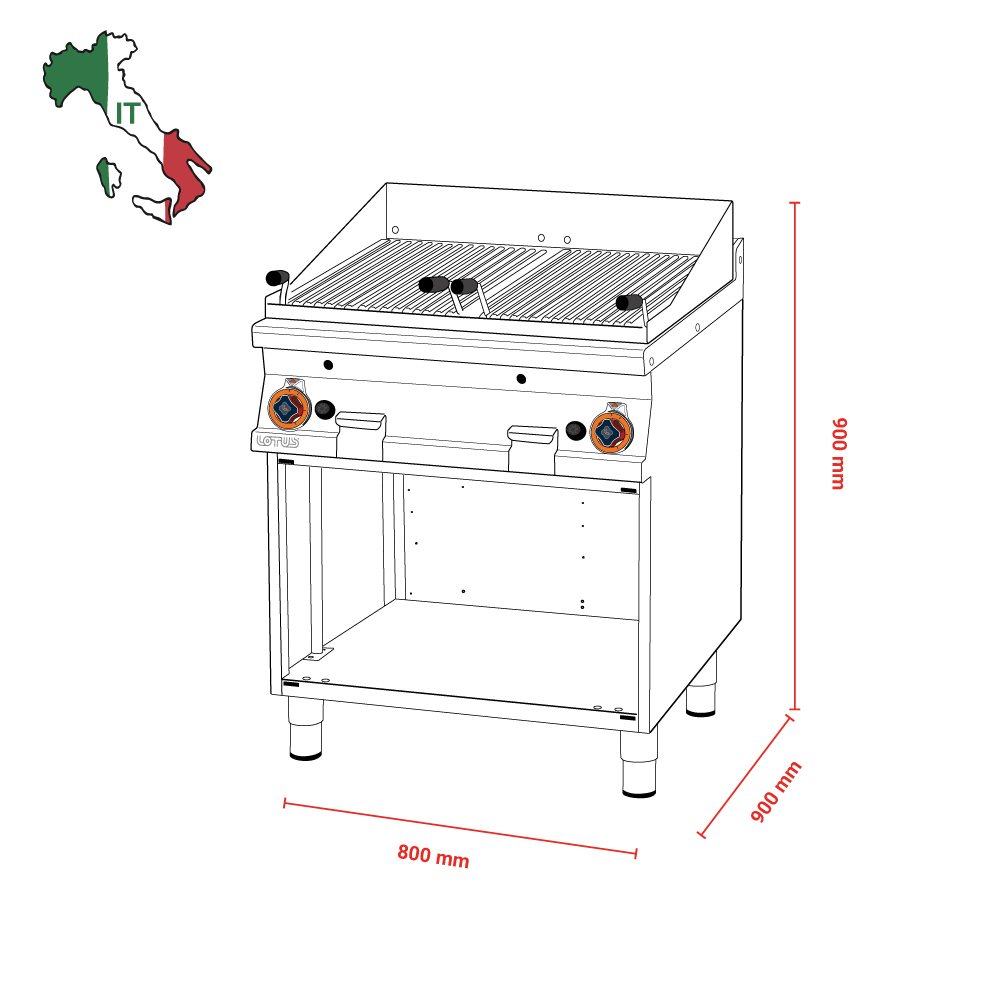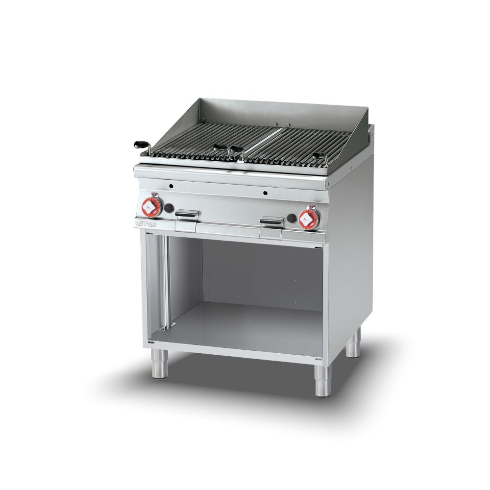 Γκριλιέρα αερίου διπλή επιδαπέδια , του εργοστασίου Lotus Ιταλίας. Κατασκευασμένο με χρήση ανοξείδωτου χάλυβα ποιότητας (CrNi 18/10 AISI 304) , με διακόπτες αδιάβροχης ποιότητας (IPX5).