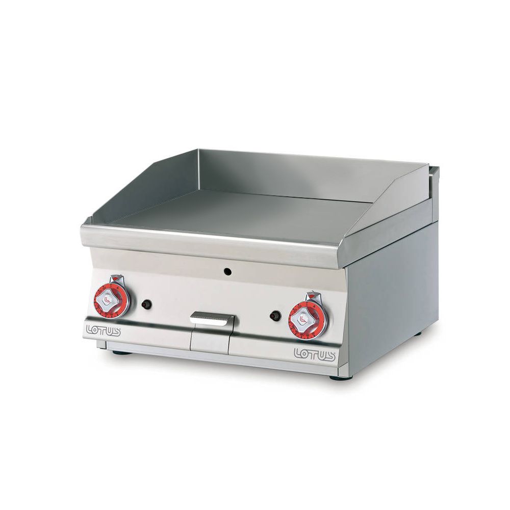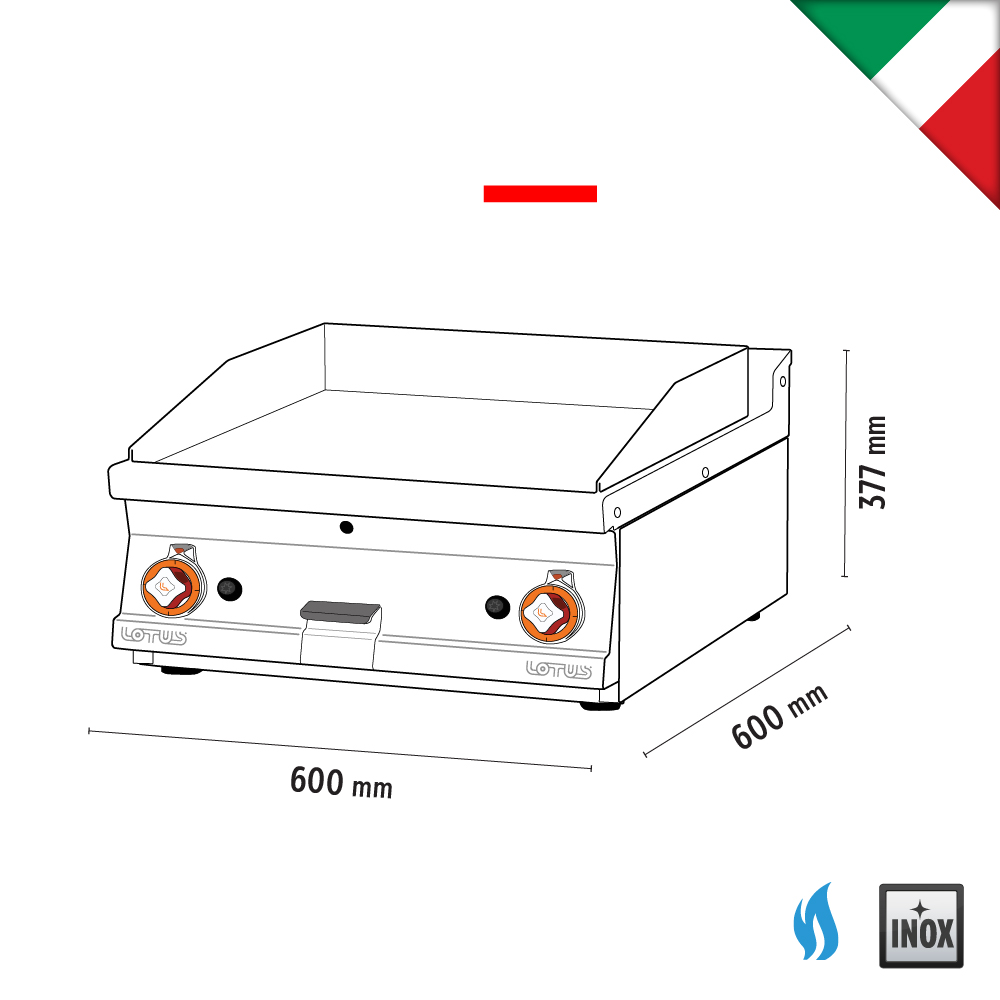 Πλατώ αερίου, μεσαίο λείο, του εργοστασίου Lotus Ιταλίας. Κατασκευασμένο με χρήση ανοξείδωτου χάλυβα ποιότητας (CrNi 18/10 AISI 304) , με διακόπτες αδιάβροχης ποιότητας (IPX5).