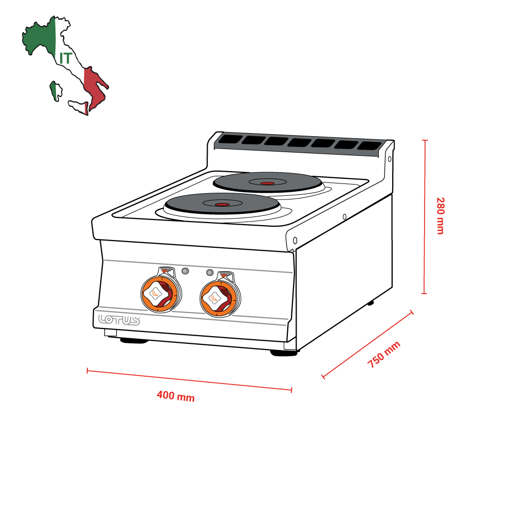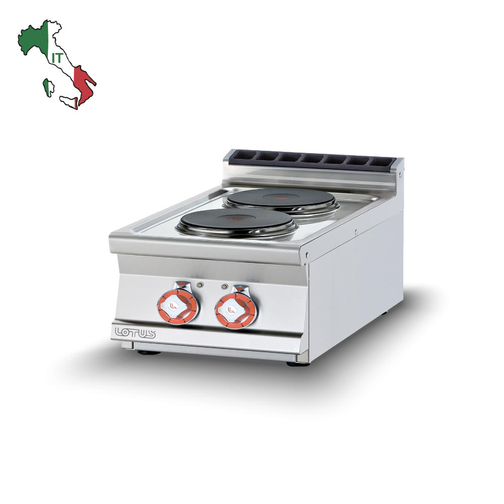 Εστία διπλή ηλεκτρική (3Kwatt) , του εργοστασίου Lotus. Κατασκευασμένο με χρήση ανοξείδωτου χάλυβα ποιότητας (CrNi 18/10 AISI 304) , με διακόπτες αδιάβροχης ποιότητας (IPX5).