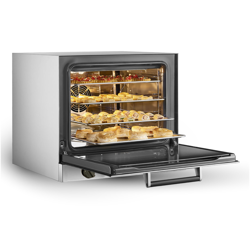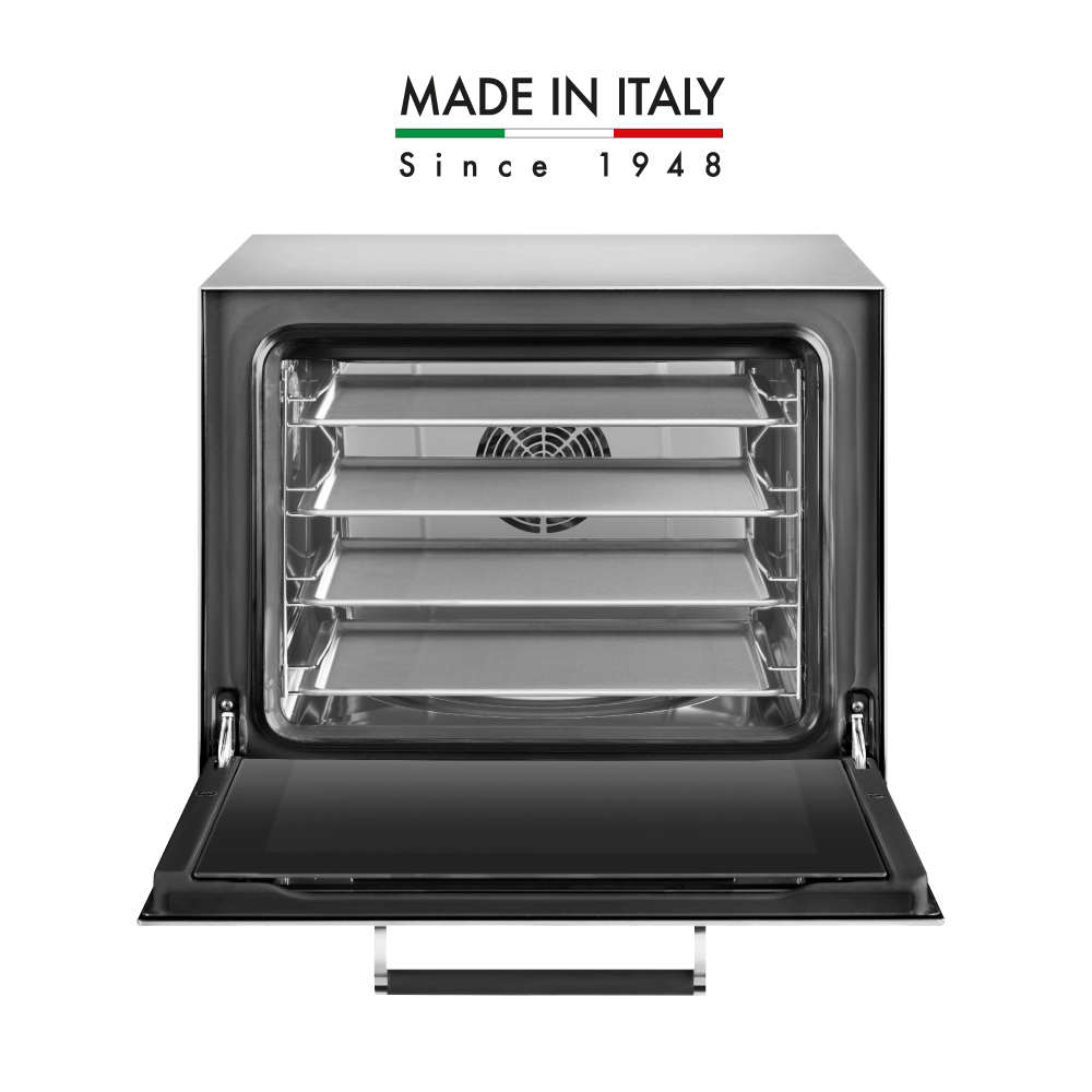 Κυκλοθερμικός φούρνος multifunction, με χωρητικότητα 4 λαμαρίνες (435x320mm), του εργοστασίου Smeg Ιταλίας. Λειτουργίες: Αερόθερμο ψήσιμο / Στατικό ψήσιμο / Στατικό Grill (κάτω) + ανεμιστήρας