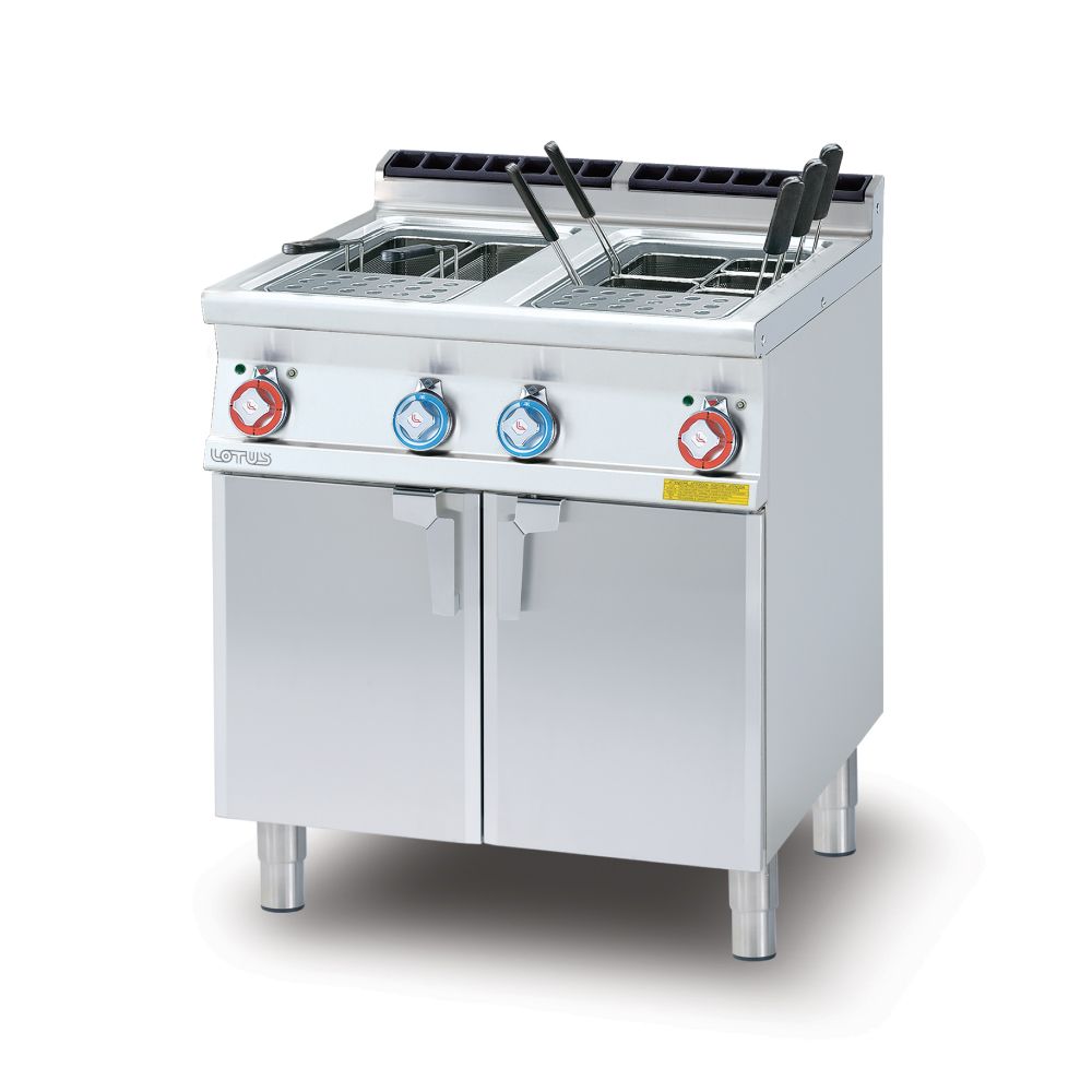 Επιδαπέδιος βραστήρας ζυμαρικών ηλεκτρικός , χωρητικότητας 25+25 lt, του εργοστασίου Lotus Ιταλίας. Κατασκευασμένο με χρήση ανοξείδωτου χάλυβα ποιότητας (CrNi 18/10 AISI 304) , με διακόπτες αδιάβροχης ποιότητας (IPX5).