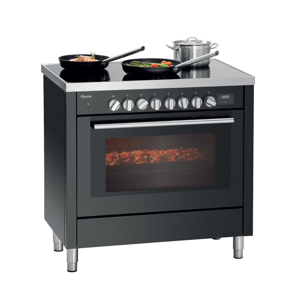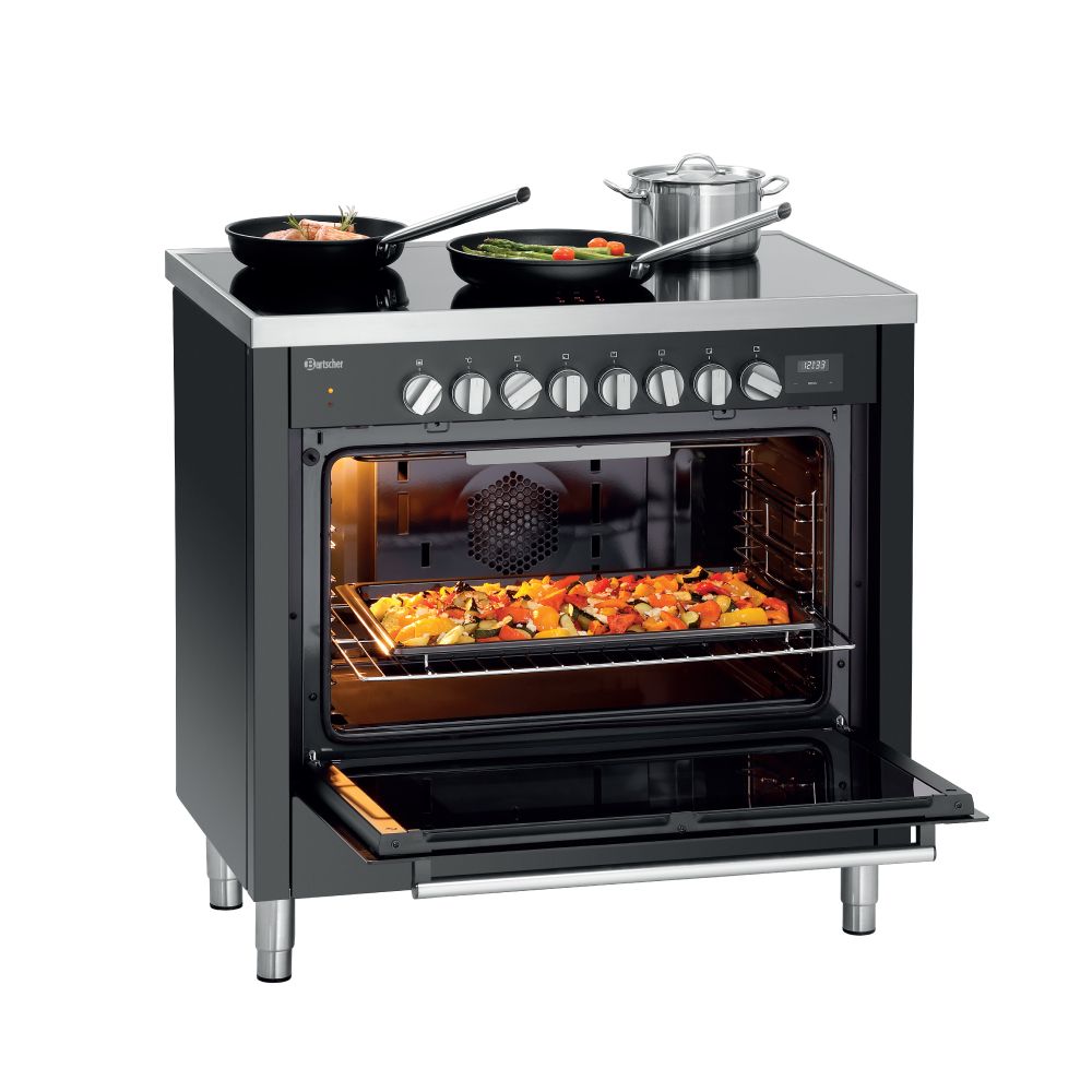 Κουζίνα ηλεκτρική με επαγωγικές εστίες & φούρνο ηλεκτρικό multifunction , 6K-EBMF Bartscher Γερμανίας. Με το κομψό μαύρο σχέδιασμό της, η κουζίνα 6K-EBMF αποτελεί την ιδανική λύση για όλες τις κουζίνες.Διαθέτει 6 επαγωγικές εστίες και έναν μεγάλο ηλεκτρικό φούρνο ψησίματος ο οποίος με τις πολλαπλές λειτουργίες του δίνει πολλά πλεονεκτήματα στον σεφ να προγραμματίσει την παρασκευή των γευμάτων του με τον καλύτερο δυνατό τρόπο.