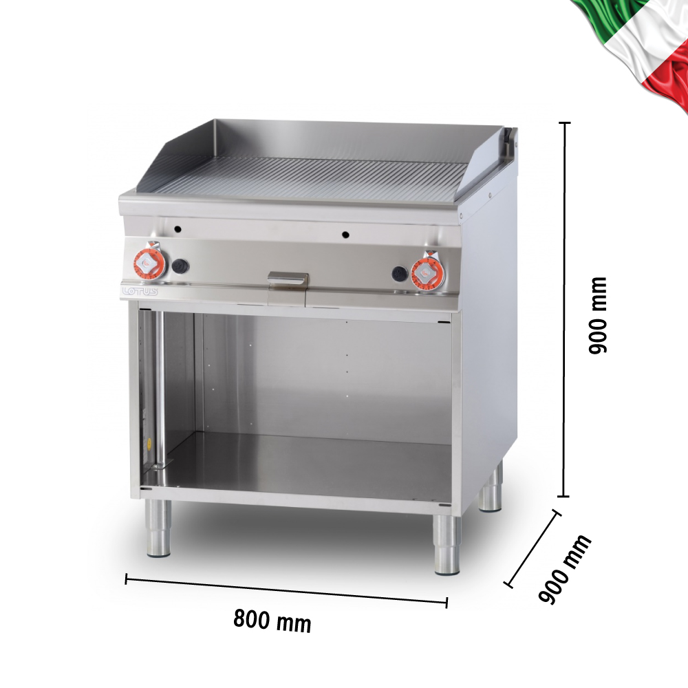Πλατώ επιδαπέδιο αερίου διπλό ραβδωτό χρωμίου , του εργοστασίου Lotus Ιταλίας Κατασκευασμένο με χρήση ανοξείδωτου χάλυβα ποιότητας (CrNi 18/10 AISI 304) , με διακόπτες αδιάβροχης ποιότητας (IPX5).