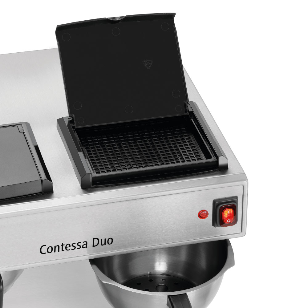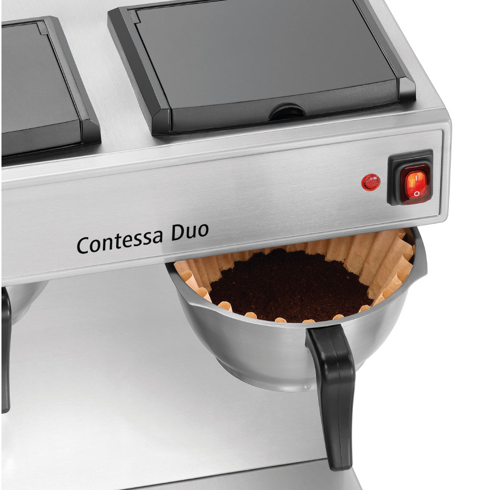 Μηχανή καφέ φίλτρου διπλή με δύο κανάτες inox 2Lt , Contessa Duo , Bartscher Γερμανίας. Η τέλεια μηχανή καφέ για τη διάθεση φίλτρου καφέ σε μπουφέ, κέτερινγκ ή εκδηλώσεις. Με την Contessa Duo μπορείτε να ετοιμάσετε έως και 13 φλιτζάνια ανά εστία απευθείας στην ισοθερμική κανάτα. Τα βελτιωμένα θερμαντικά στοιχεία από ανοξείδωτο χάλυβα προσφέρουν βέλτιστη μετάδοση θερμότητας.