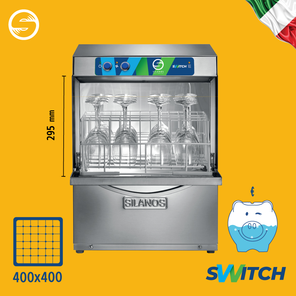 Πλυντήριο ποτηριών-πιάτων για καλάθι 40x40cm, του ιταλικού εργοστασίου Silanos. Το διαδοχικό ξέβγαλμα TM μειώνει την κατανάλωση νερού κατά 50% και συνεπώς μειώνει την κατανάλωση απορρυπαντικού , την κατανάλωση ηλεκτρικής ενέργειας και τις εκπομπές άνθρακα (CO2).