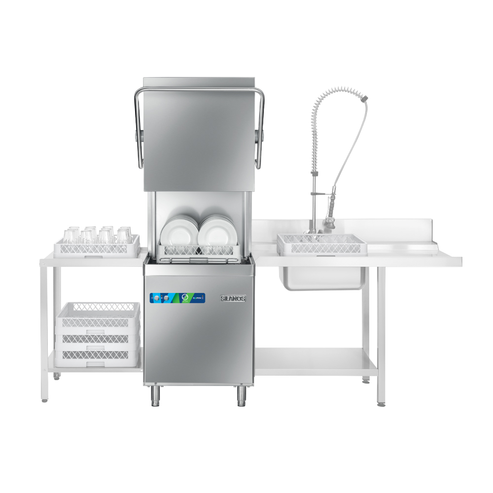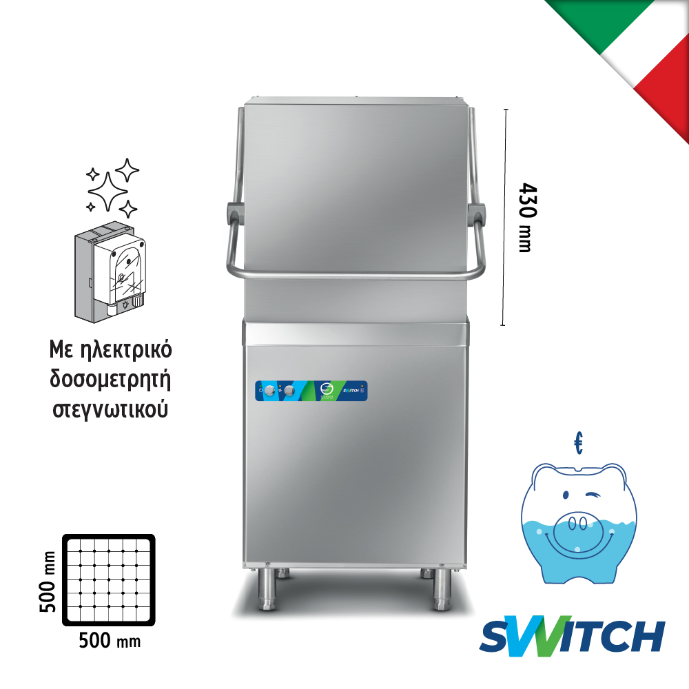 Πλυντήριο ποτηριών-πιάτων για καλάθι 50x50cm, του ιταλικού εργοστασίου Silanos. Το διαδοχικό ξέβγαλμα TM μειώνει την κατανάλωση νερού κατά 50% και συνεπώς μειώνει την κατανάλωση απορρυπαντικού , την κατανάλωση ηλεκτρικής ενέργειας και τις εκπομπές άνθρακα (CO2).