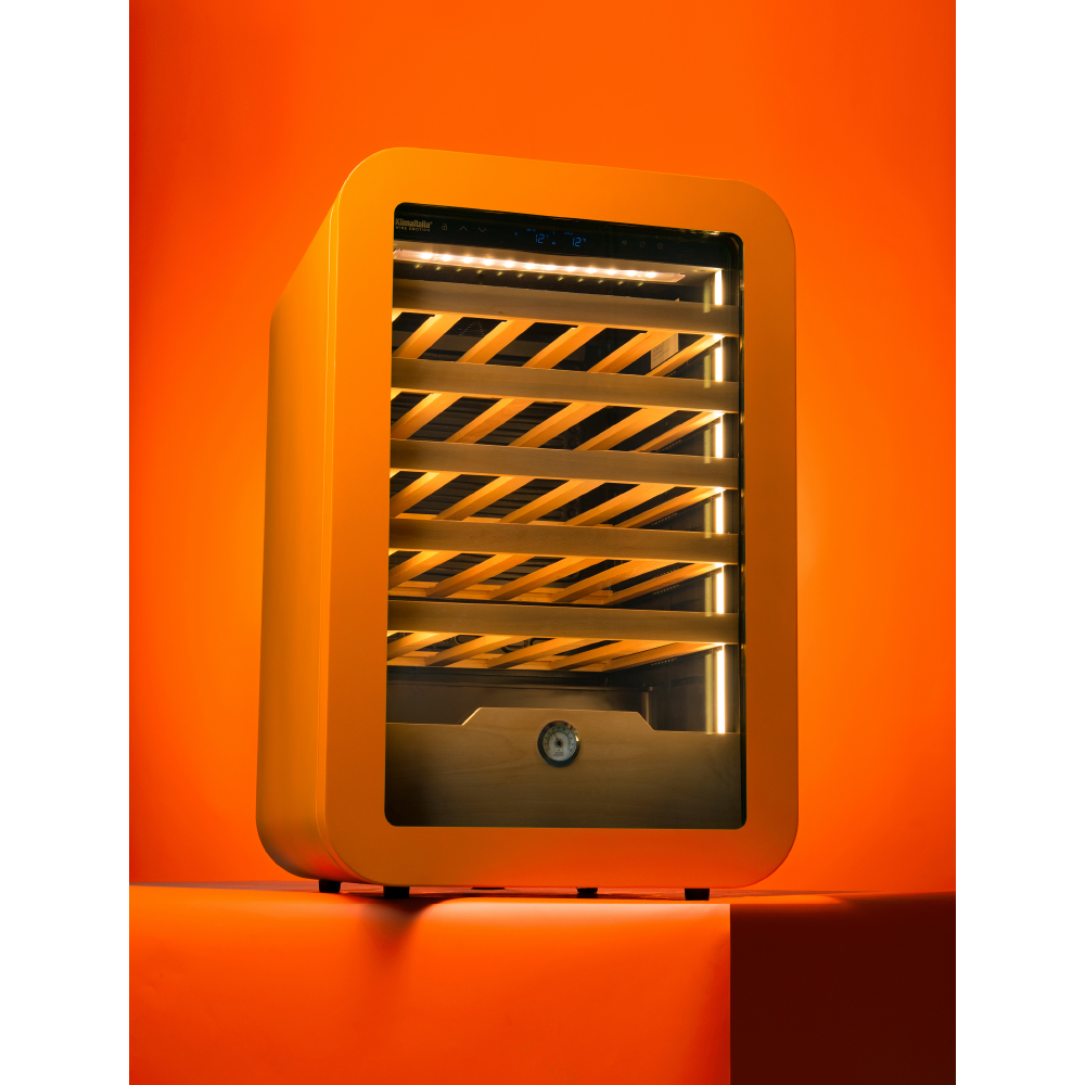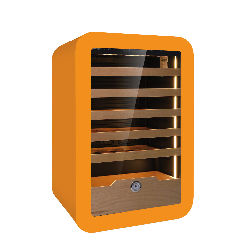 Βιτρίνα συντήρησης κρασιών πορτοκαλί χρώματος , χωρητικότητας 126 lt. Προμηθευτής : Klimaitalia