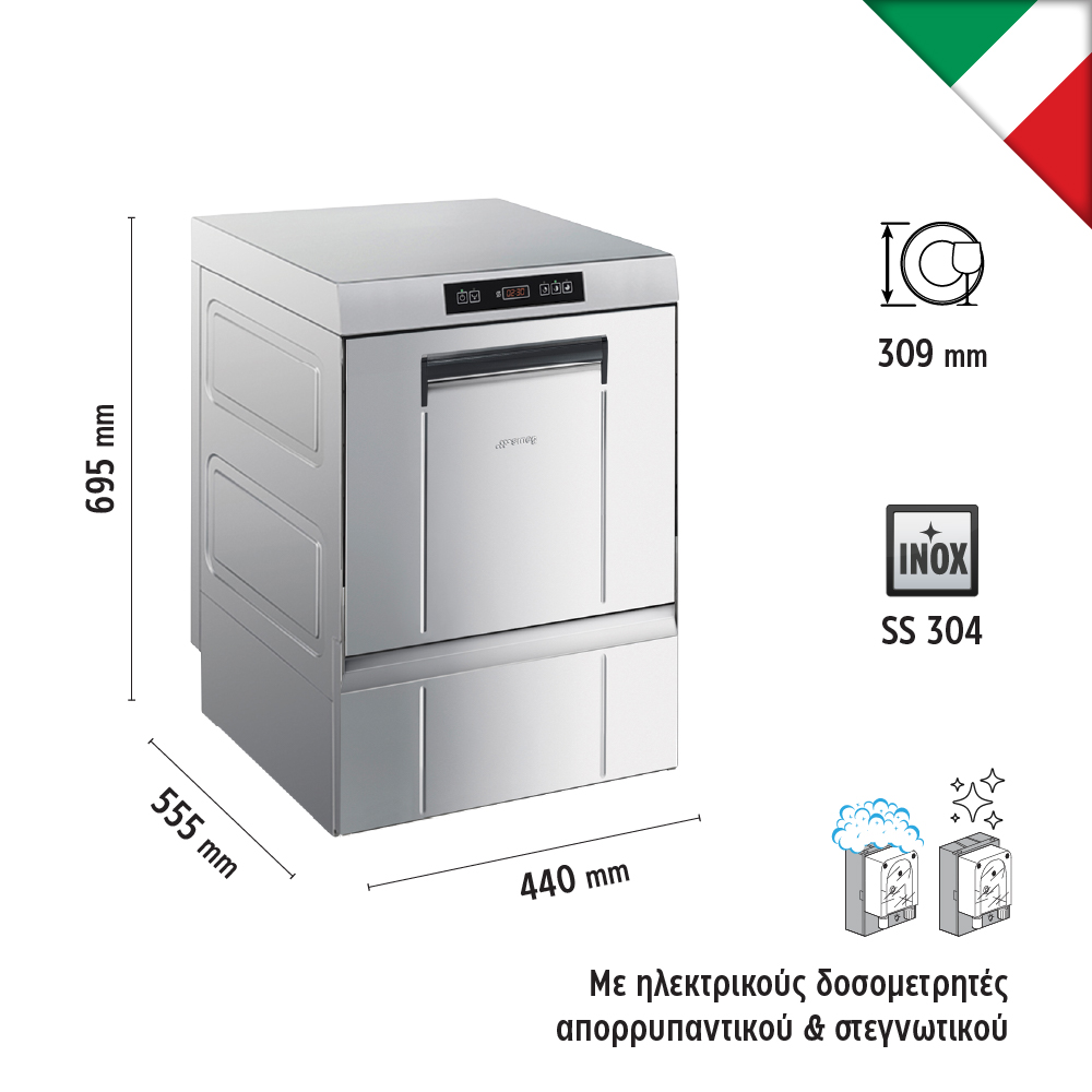 Πλυντήριο ποτηριών-πιάτων για καλάθι 40x40cm, με αντλία απόπλυσης, σειράς ecoline του ιταλικού εργοστασίου Smeg. Συμπεριλαμβάνονται: 2 καλάθια γενικής χρήσης & 1 μονή θήκη για μαχαιροπήρουνα.