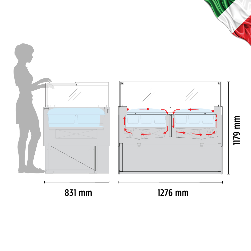 Βιτρίνα παγωτού βεβιασμένης ψύξης , 1276x831x1170(h)mm , του εργοστασίου ISA Ιταλίας. Χωρητικότητα 6+6 λεκανάκια 5lt.