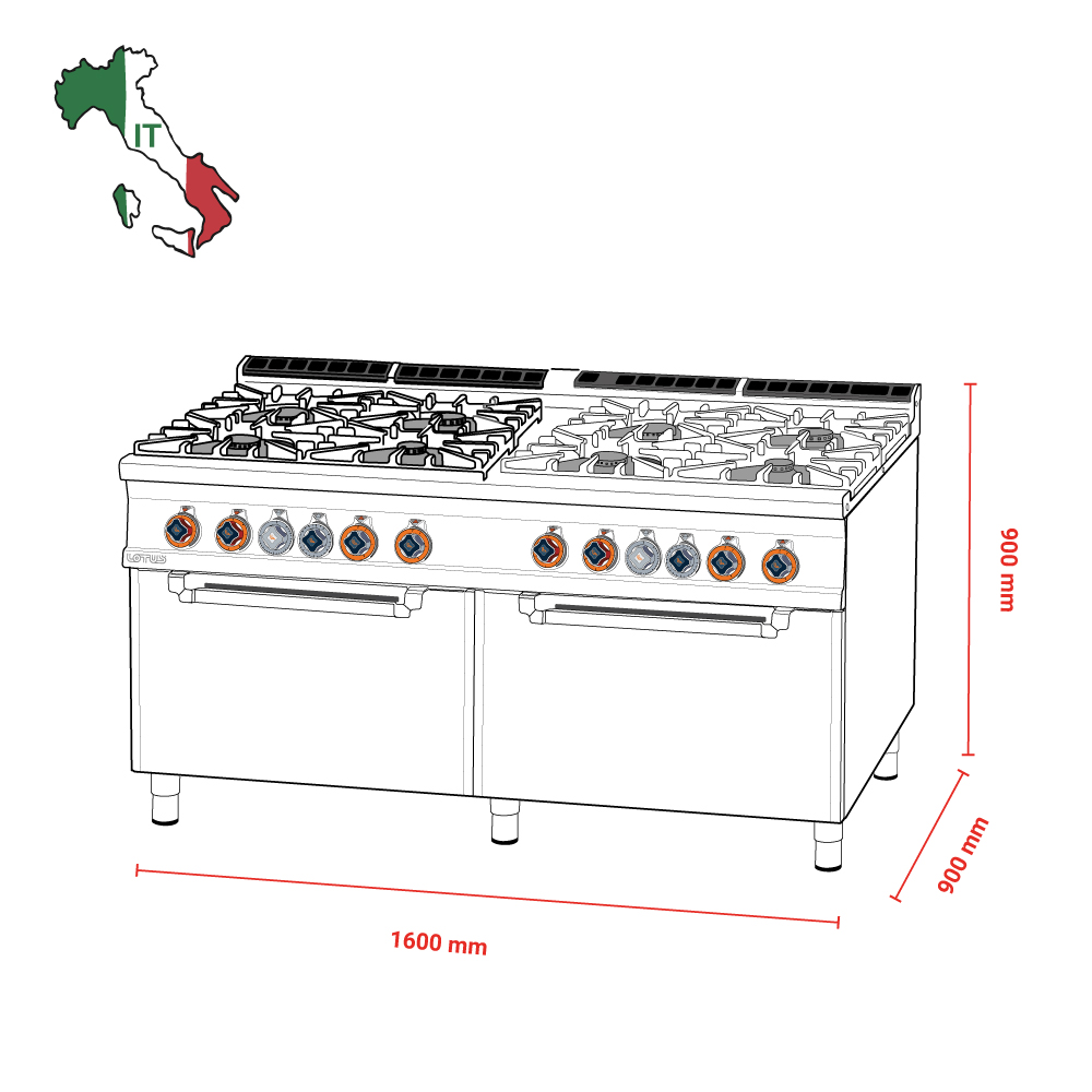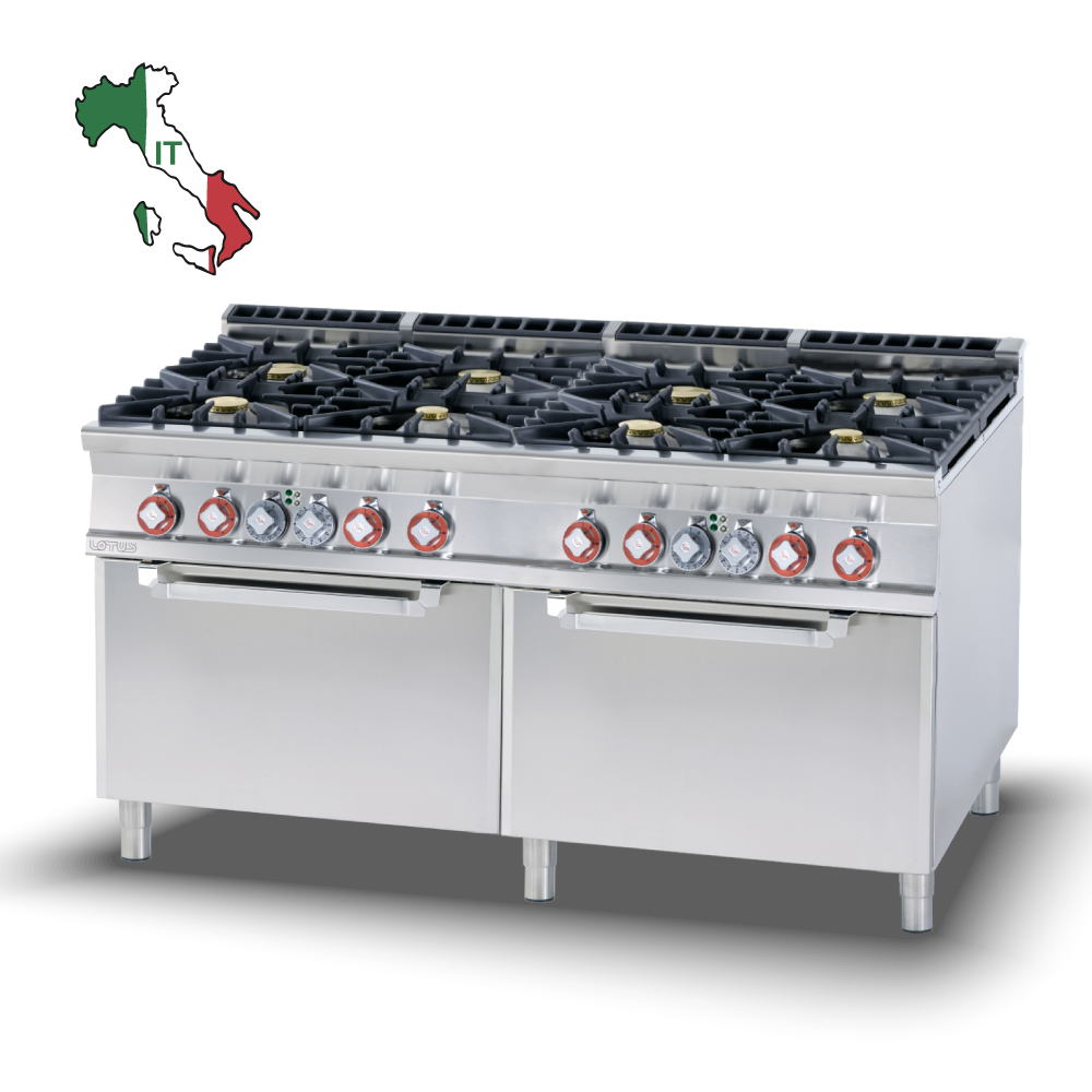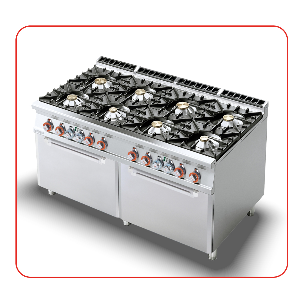 Κουζίνα αερίου 8 εστιών με 2 φούρνους αερίου στατικούς , του εργοστασίου Lotus. Κατασκευασμένο με χρήση ανοξείδωτου χάλυβα ποιότητας (CrNi 18/10 AISI 304) , με διακόπτες αδιάβροχης ποιότητας (IPX5).