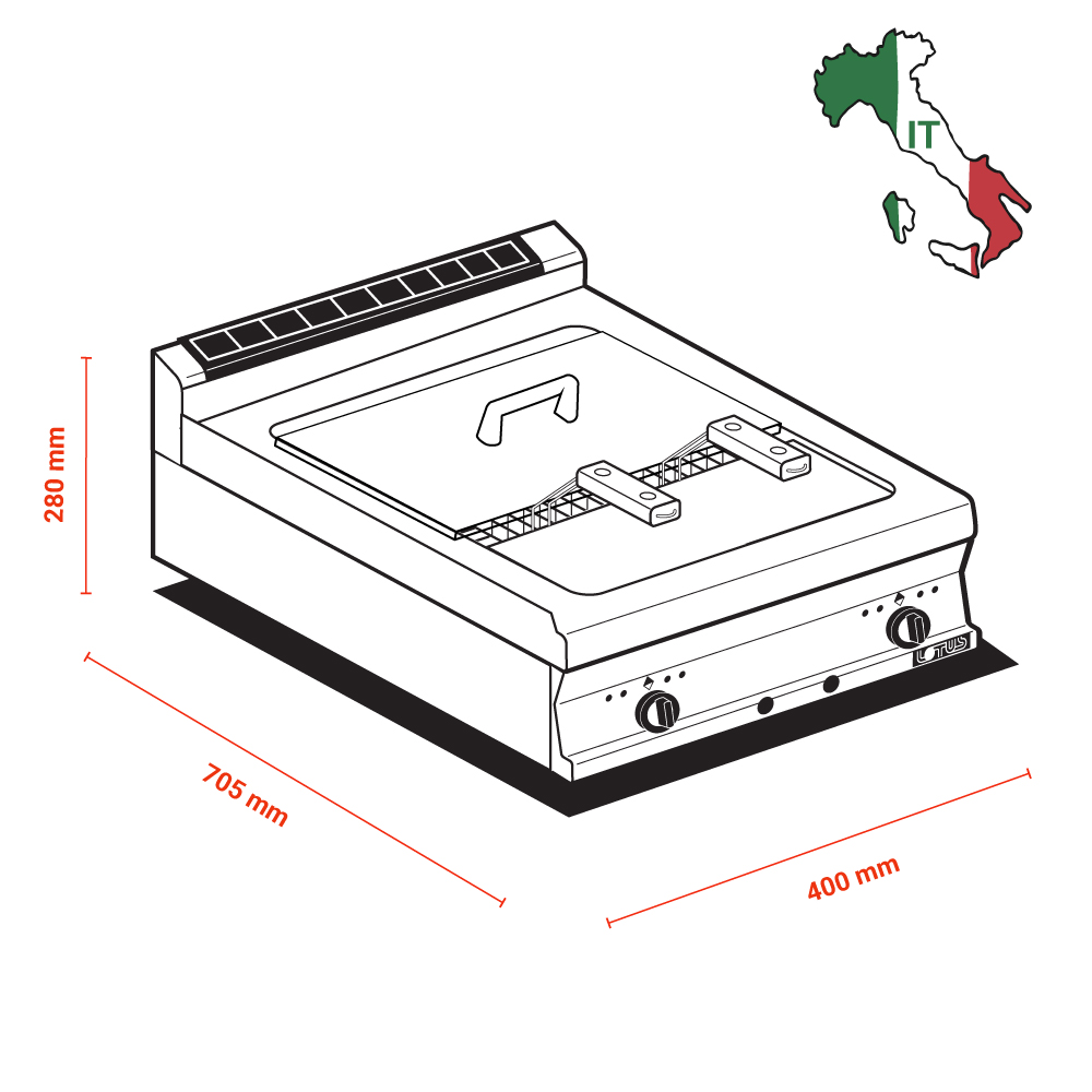 Φριτέζα αερίου διπλή, χωρητικότητας 8+8 lt, του εργοστασίου Lotus Ιταλίας. Κατασκευασμένο με χρήση ανοξείδωτου χάλυβα ποιότητας (CrNi 18/10 AISI 304) , με διακόπτες αδιάβροχης ποιότητας (IPX5).