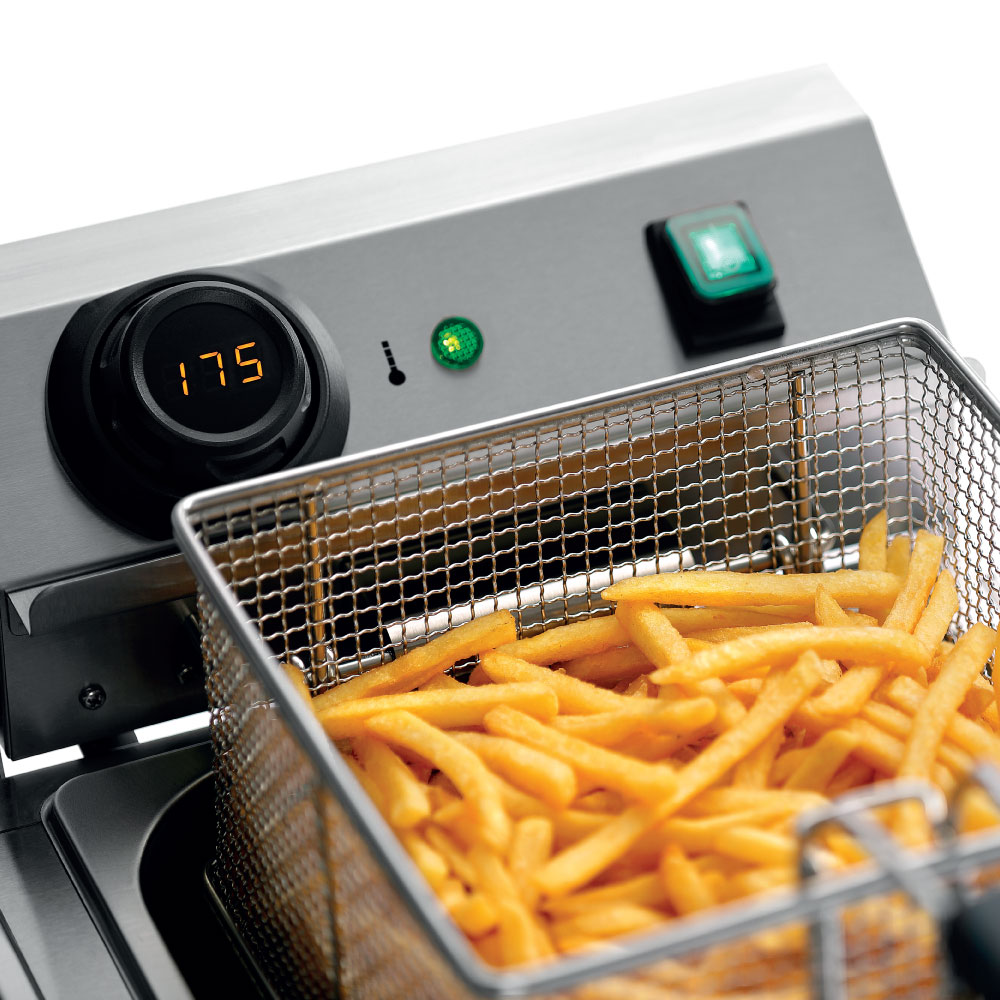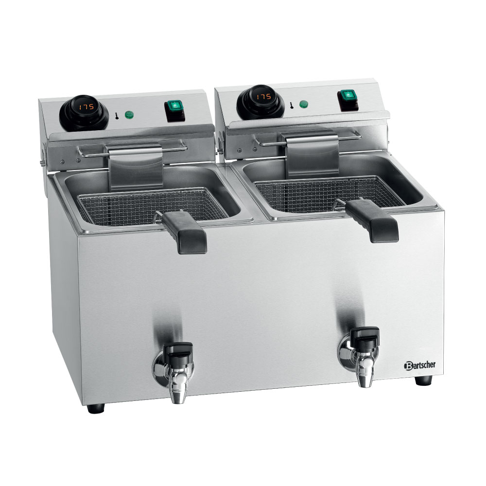 Φριτέζα επιτραπέζια ηλεκτρική διπλή , χωρητικότητας 9+9 λίτρων , MDI Snack IV Plus Bartscher Γερμανίας. Σωστό τηγάνισμα που γίνεται εύκολα: Με τον ψηφιακό μοχλό MDI της Bartscher, η θερμοκρασία μπορεί να ρυθμιστεί με ακρίβεια. Επιπλέον, μπορείτε να ελέγχετε ανά πάσα στιγμή την τρέχουσα θερμοκρασία λαδιού.