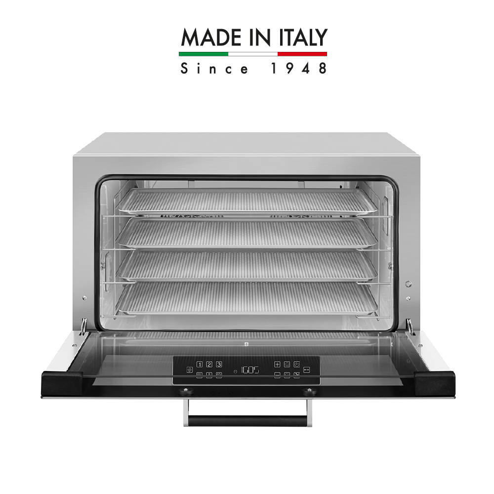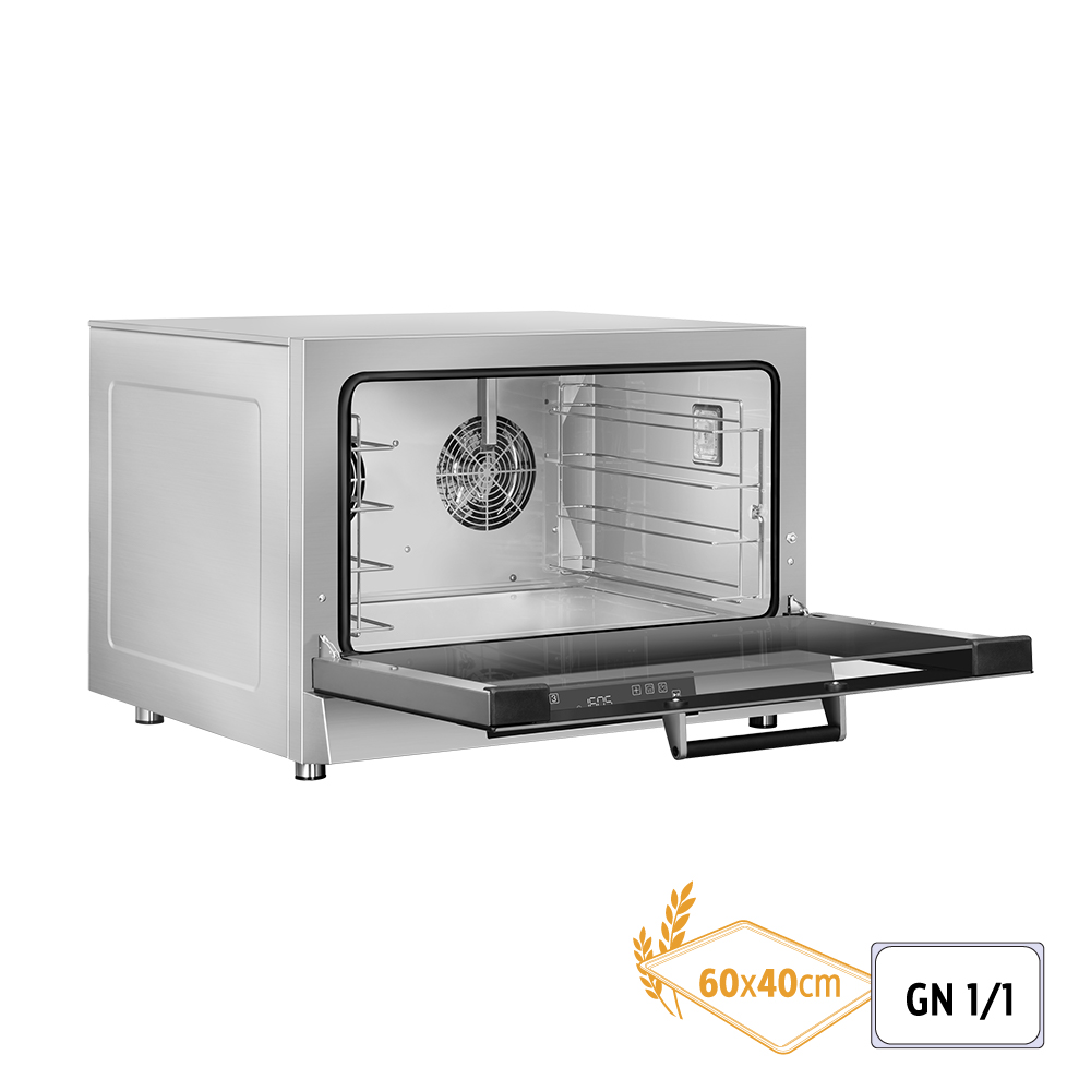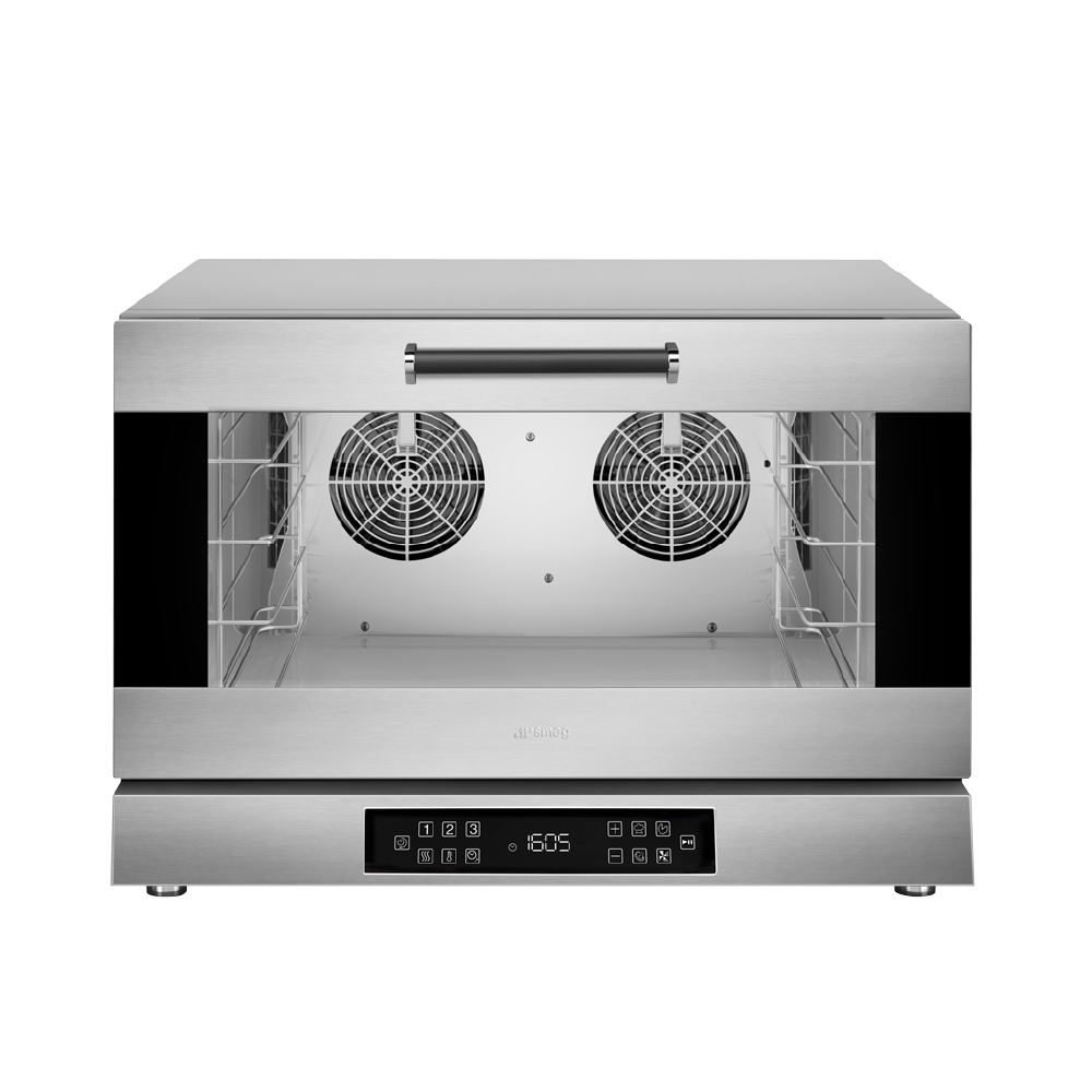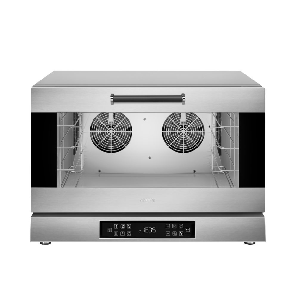 Κυκλοθερμικός φούρνος με υγραντήρα απ’ευθείας ψεκασμού , digital (ηλεκτρονικός χειρισμός) , χωρητικότητας 4 λαμαρινών (600x400mm) ή GN 1/1 του εργοστασίου Smeg Ιταλίας. Λειτουργίες : Αερόθερμο Ψήσιμο & Υγραντήρας