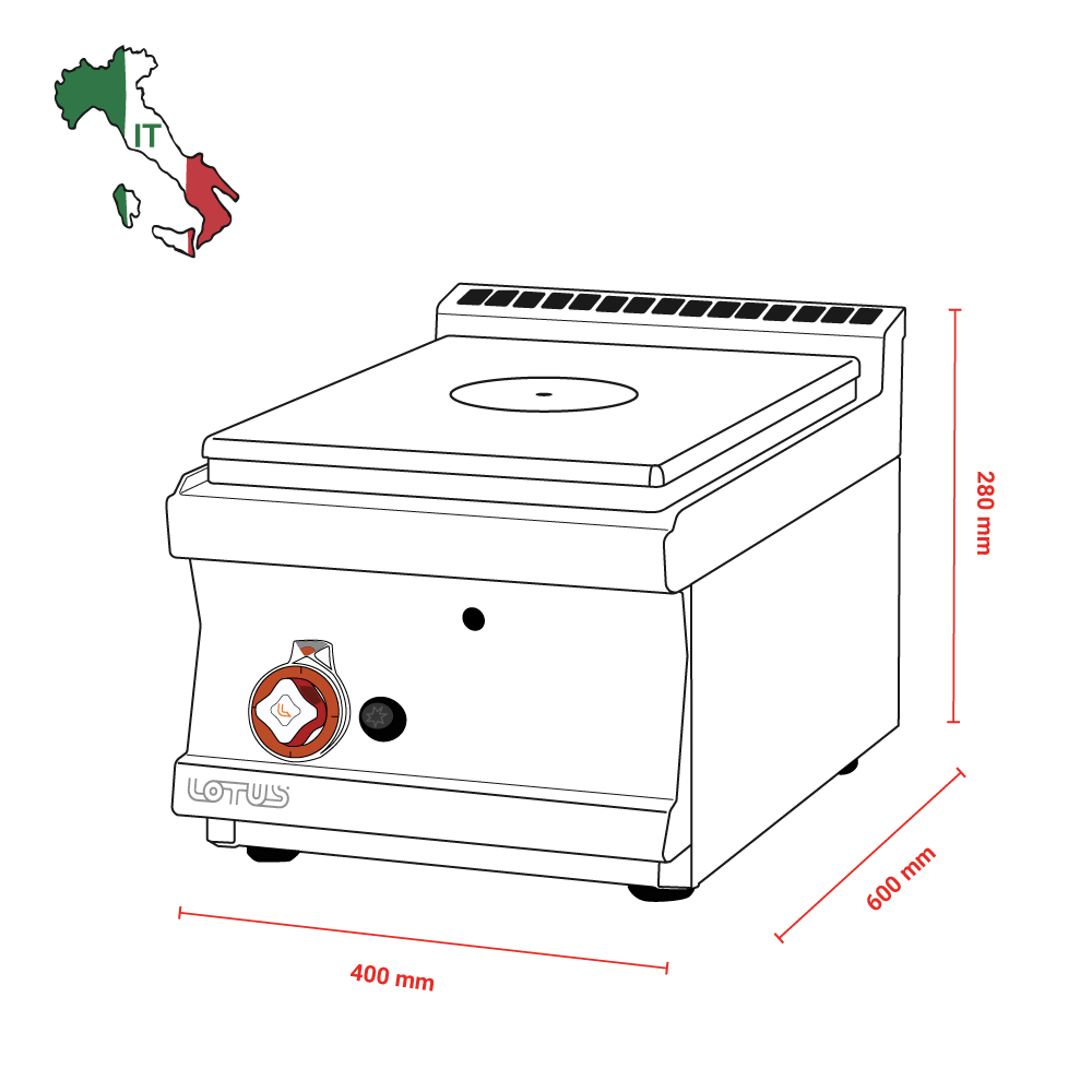 Κουζίνα αερίου με ενιαία πλάκα hot top, του εργοστασίου Lotus. Κατασκευασμένο με χρήση ανοξείδωτου χάλυβα ποιότητας (CrNi 18/10 AISI 304) , με διακόπτες αδιάβροχης ποιότητας (IPX5).
