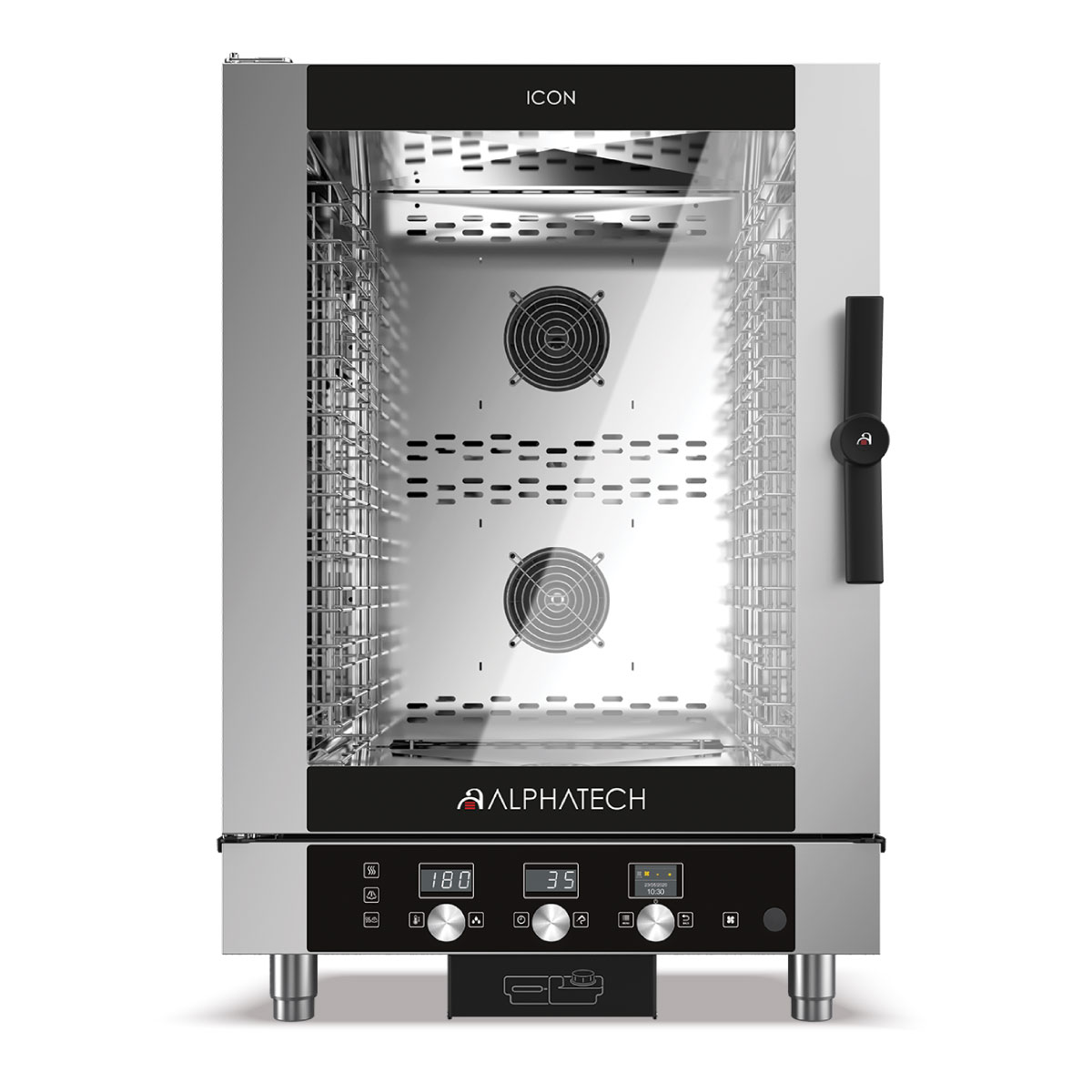 Φούρνος Icon 10 θέσεων (600x400mm ή GN 1/1), με ηλεκτρονικό χειρισμό ,  Alphatech Ιταλίας. Οι φούρνοι Icon αποτελούν την ιδανική λύση για επιχειρήσεις όπως cafe-bar , αναψυκτήρια , μικρά εστιατόρια ή εταιρίες. Οι μικρές τους διαστάσεις σε συνδυασμό με τις υψηλές προδιογραφές τους δίνουν στον χρήστη του φούρνου την δυνατότητα για γρήγορη και εξαιρετικής ποιότητας παρασκευής φαγητού. Κάθε πιάτο είναι ένα αριστούργημα από το μαγείρεμα στον ατμό , το τηγάνισμα και το ψήσιμο στην σχάρα.