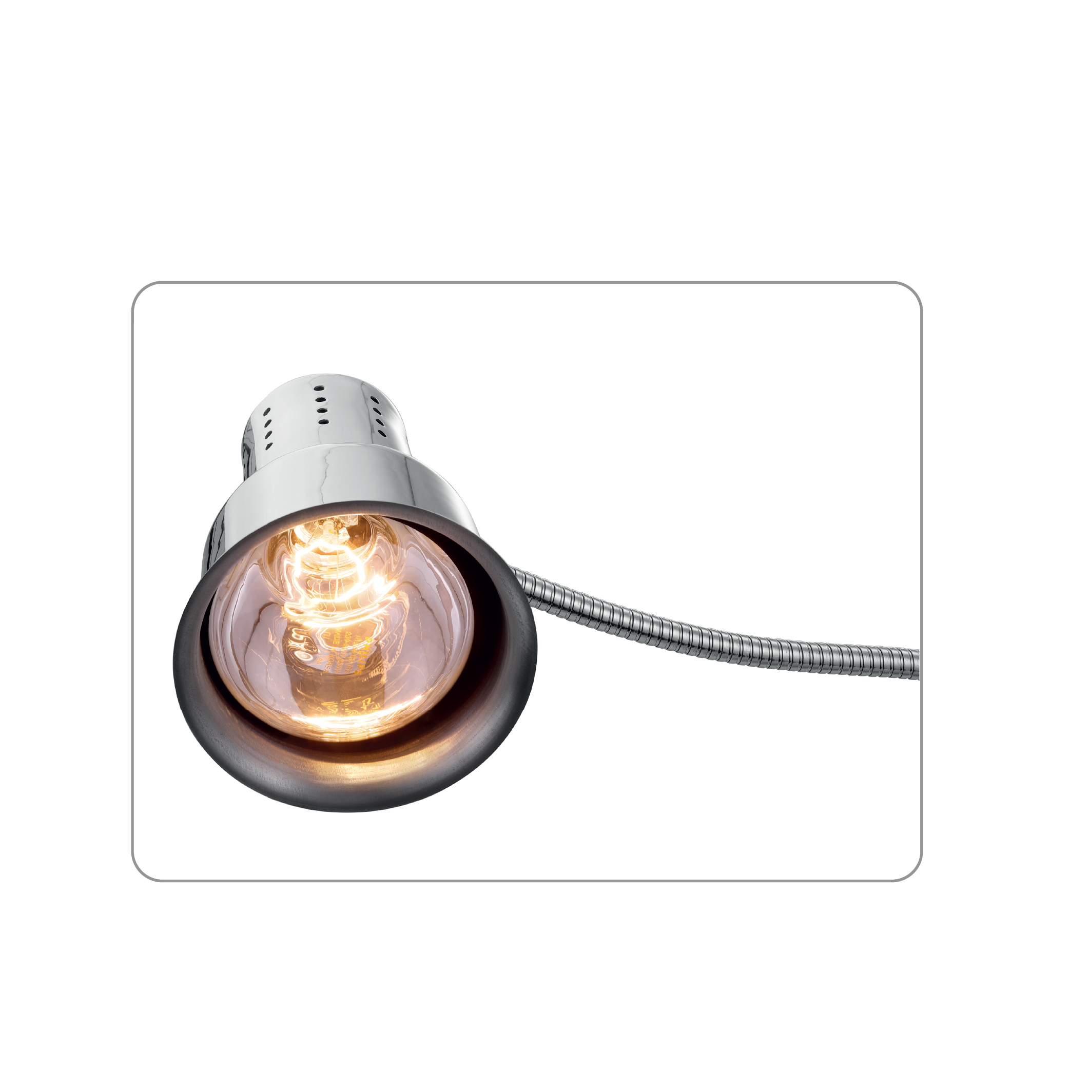 Θερμαντική λυχνία , IWL250ST, Bartscher Γερμανίας. Χάρη στη θερμότητα υπέρυθρων και τον κινητό βραχίονα λυχνίας, η θερμαντική λυχνία προσφέρει ευέλικτη χρήση που προσαρμόζεται στις ανάγκες – Είτε πρόκειται για την προετοιμασία είτε για τη διανομή γευμάτων είτε τον μπουφέ.