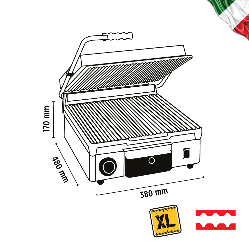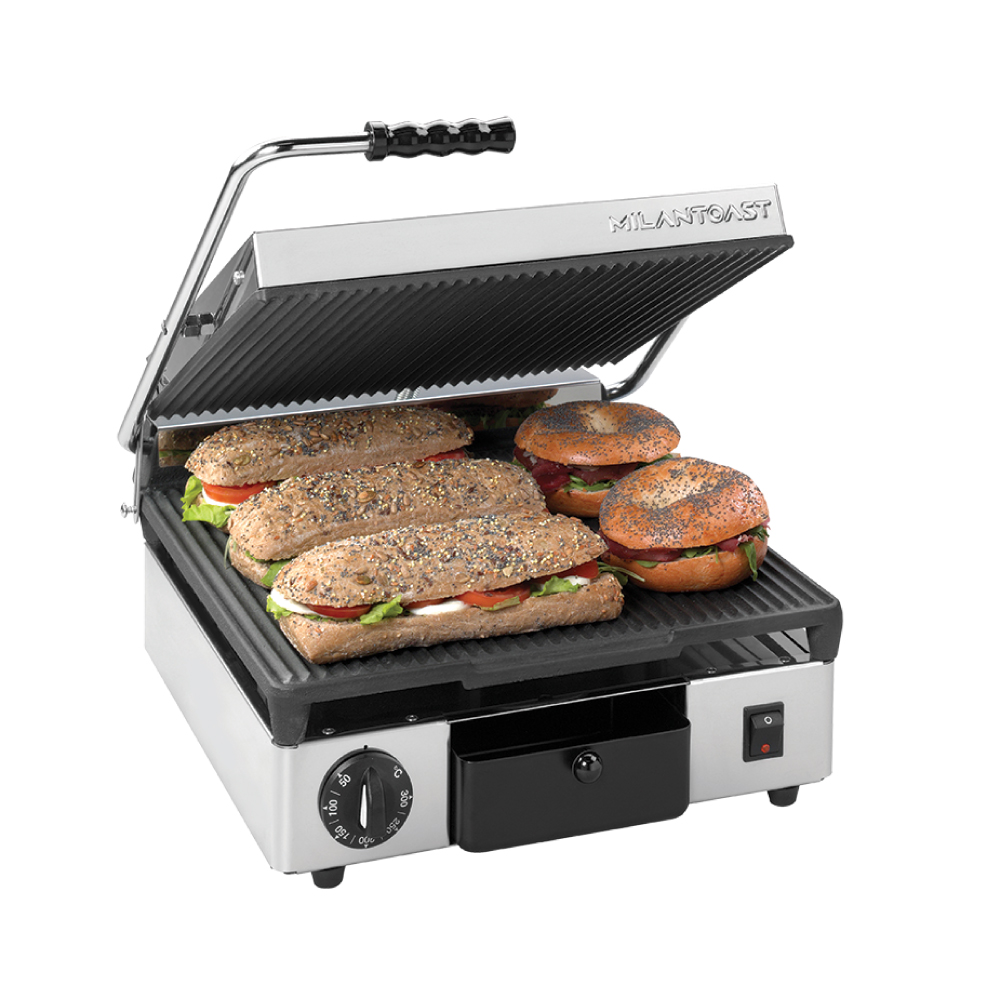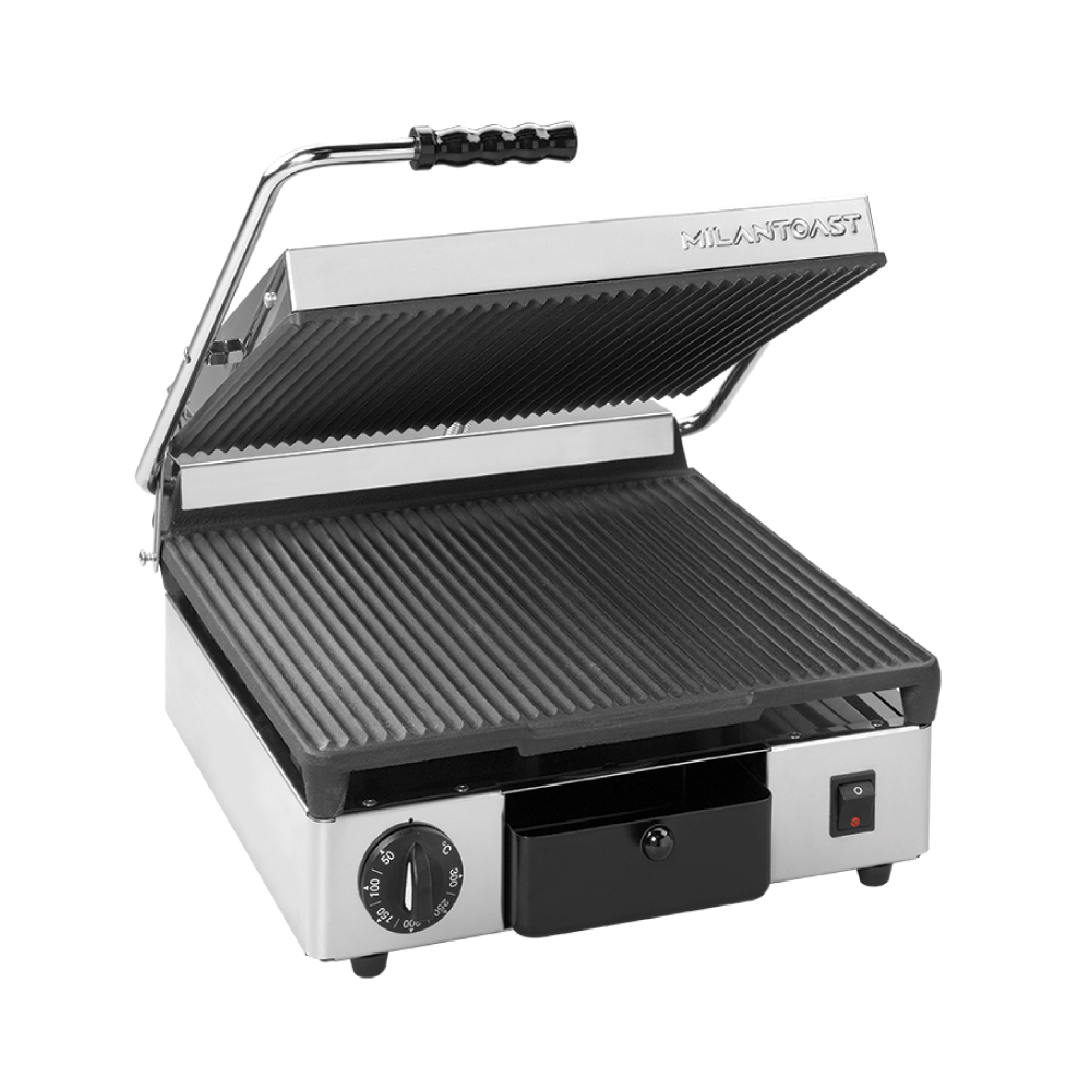 Τοστιέρα large ραβδωτή πάνω & κάτω, Milantoast Ιταλίας. Επαγγελματική τοστιέρα μαντεμένια , με δομή από ανοξείδωτο χάλυβα και αντικολλητικές πλάκες από χυτοσίδηρο, κατασκευασμένη με ειδική επιφανειακή κεραμική επίστρωση που κάνει τις πλάκες ιδιαίτερα ανθεκτικές στα οξέα, το αλάτι και τη διάβρωση, ενώ επιτρέπει τον εύκολο και γρήγορο καθαρισμό. Οι αντικολλητικές πλάκες από χυτοσίδηρο είναι γνωστές για τις ιδιότητες συγκράτησης της θερμότητας και επιτρέπουν γρήγορους χρόνους θέρμανσης και εξαιρετική διατήρηση της θερμότητας ώστε να προσφέρουν τα εξαιρετικά και σταθερά αποτελέσματα μαγειρέματος που απαιτούνται για μια γρήγορη παρασκευή φαγητού. Η τοστιέρα 16020 της Milantoast είναι η ιδανική επιλογή για εστιατόρια και καφετέριες καθώς είναι πολύ εύκολη στη χρήση με την αυτοεξισορροπούμενη επάνω πλάκα της με ρυθμιζόμενη πίεση κλεισίματος στο πάχος του φαγητού και την αποστράγγιση λίπους στο κάτω μέρος.